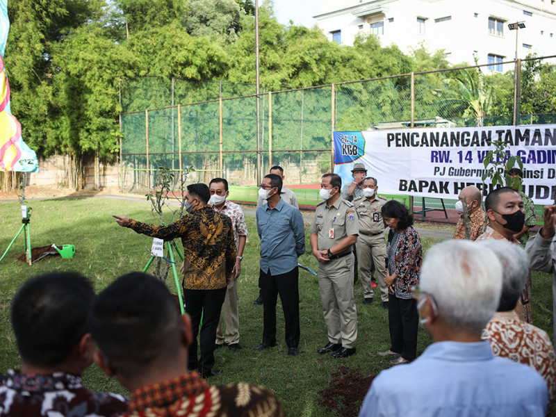 Penjabat (Pj) Gubernur DKI Jakarta, Heru Budi Hartono, melakukan pencanangan taman lingkungan di RW 014, Perumahan Villa Gading Indah, Kelapa Gading Barat, Jakarta Utara, Selasa (22/11). Pencanangan dilakukan secara simbolis dengan penanaman pohon bersama Duta Besar RI untuk Korea Selatan, Gandi Sulistiyanto, dan Wali Kota Jakarta Utara, Ali Maulana Hakim. (Foto: Nugroho Sejati/beritajakarta.id)