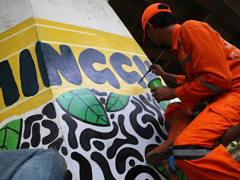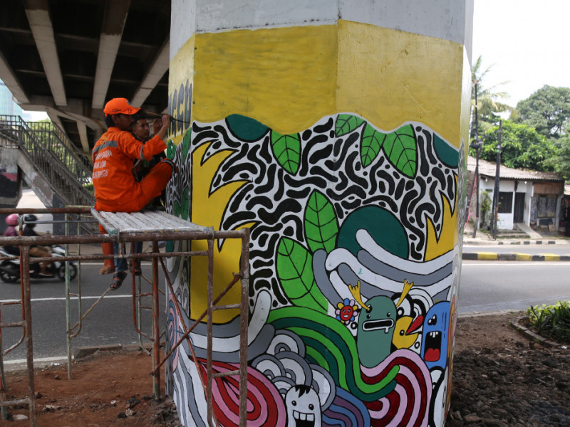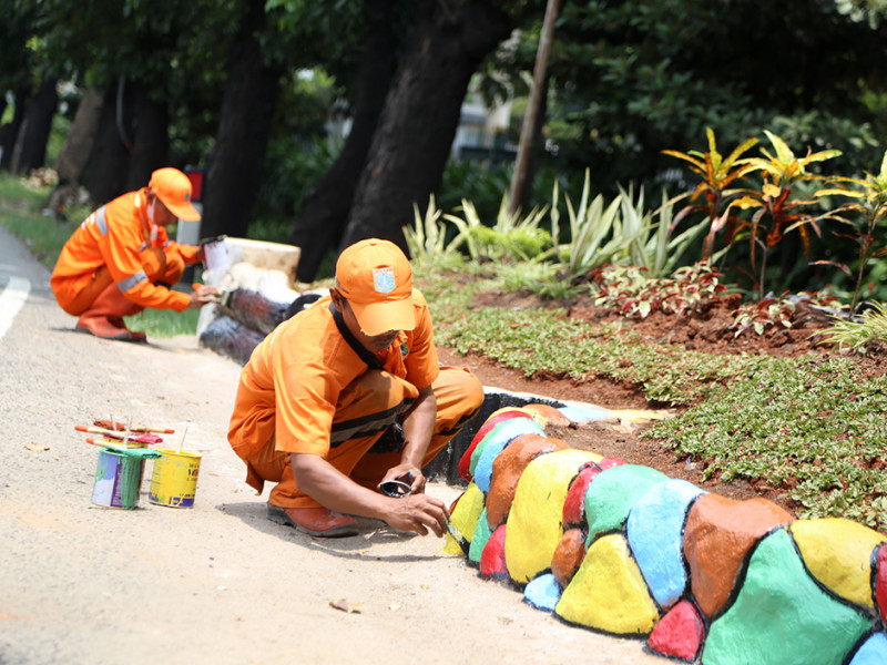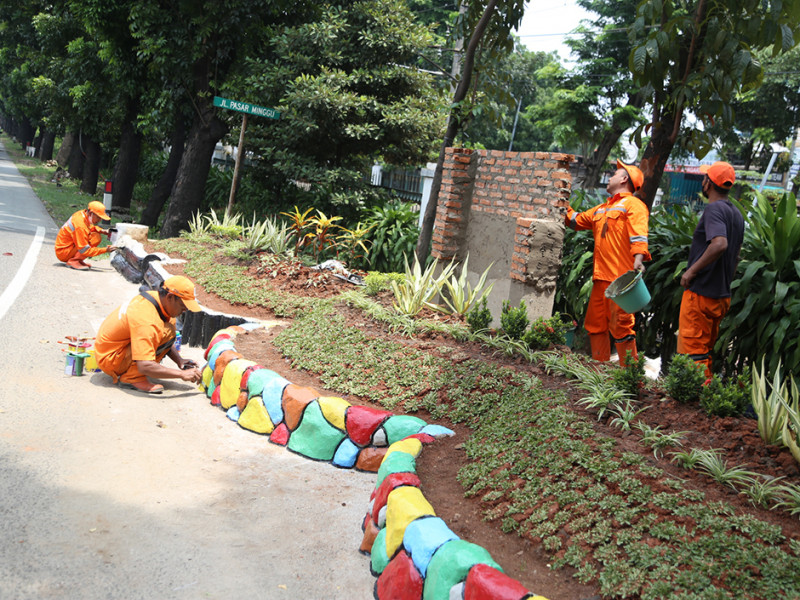 Petugas Penanganan Prasarana dan Sarana Umum (PPSU) melakukan penataan jalur hijau di Jalan Raya Pasar Minggu, Jakarta Selatan. Pengerjaan meliputi penanaman sejumlah tanaman hias dan pembuatan mural. (Foto: Reza Hapiz/beritajakarta.id)
