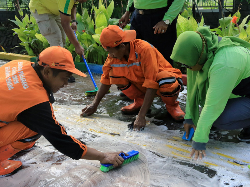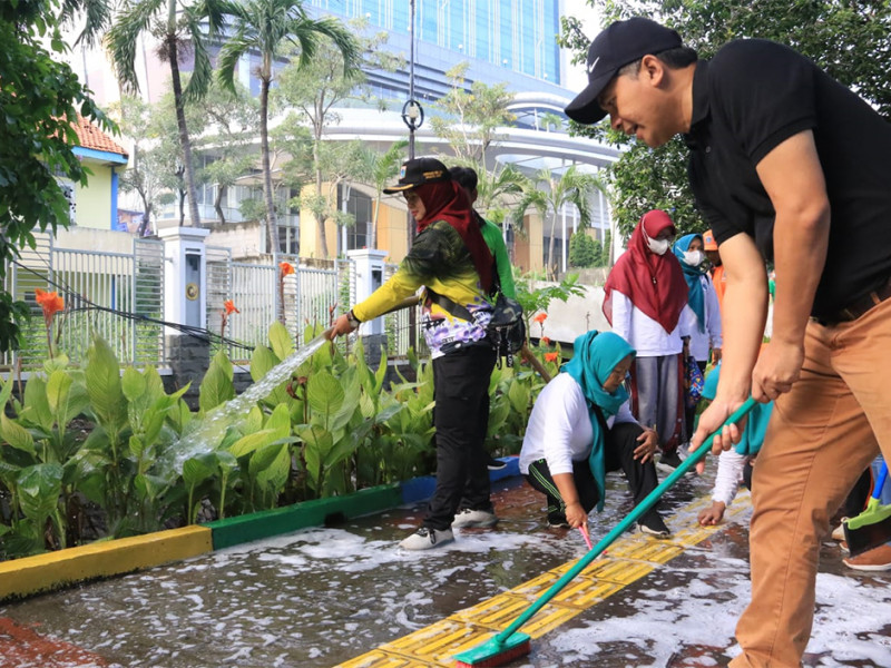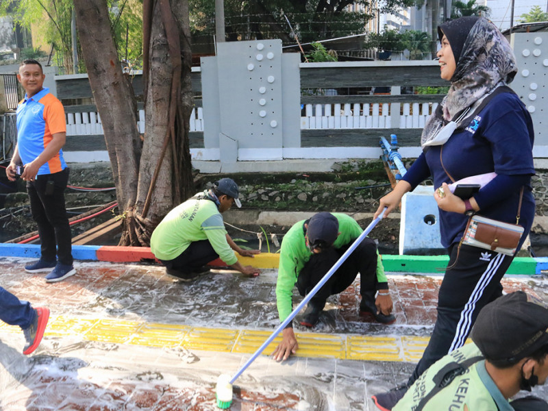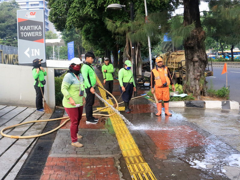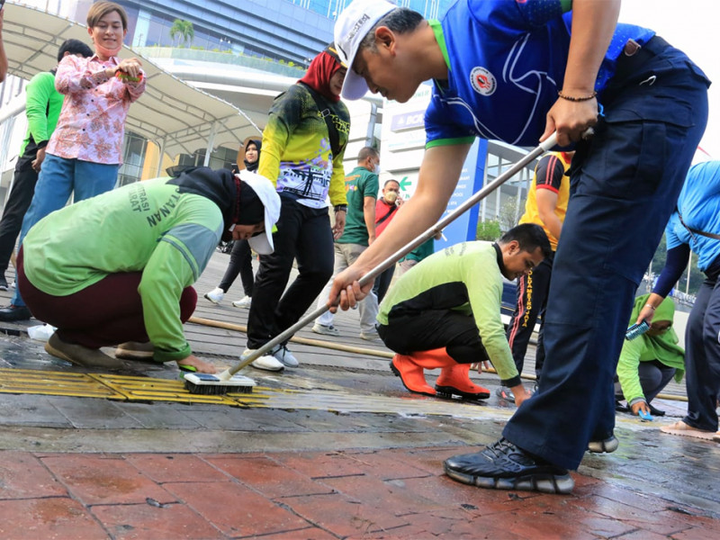 Ratusan personel lintas Organisasi Perangkat Daerah (OPD) melakukan aksi kerja bakti membersihkan trotoar di kawasan Grogol, Grogol Petamburan, Jakarta Barat, Minggu (27/11). Kerja bakti dilakukan sepanjang 1,2 kilometer, tepatnya dari depan ITC Roxi di Jalan Kyai Tapa hingga Universitas Tarumanegara di Jalan Letjen S Parman. (Foto: Reza Hapiz/beritajakarta.id)