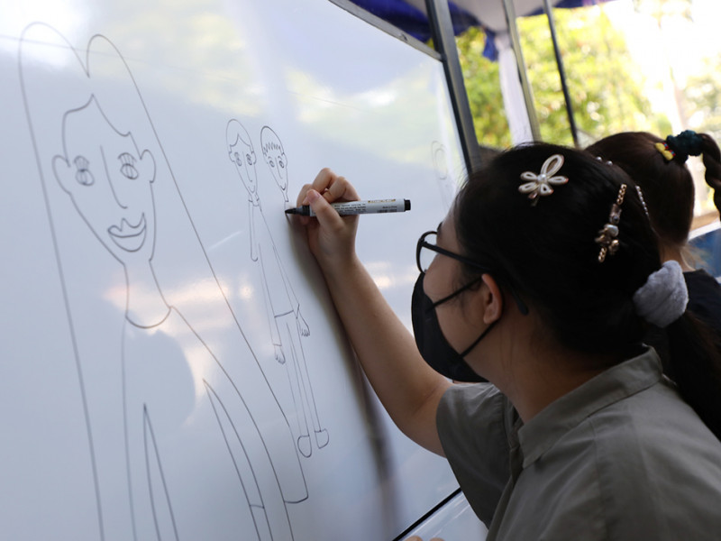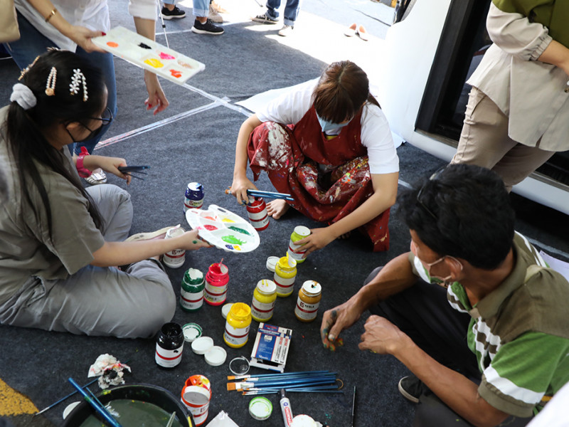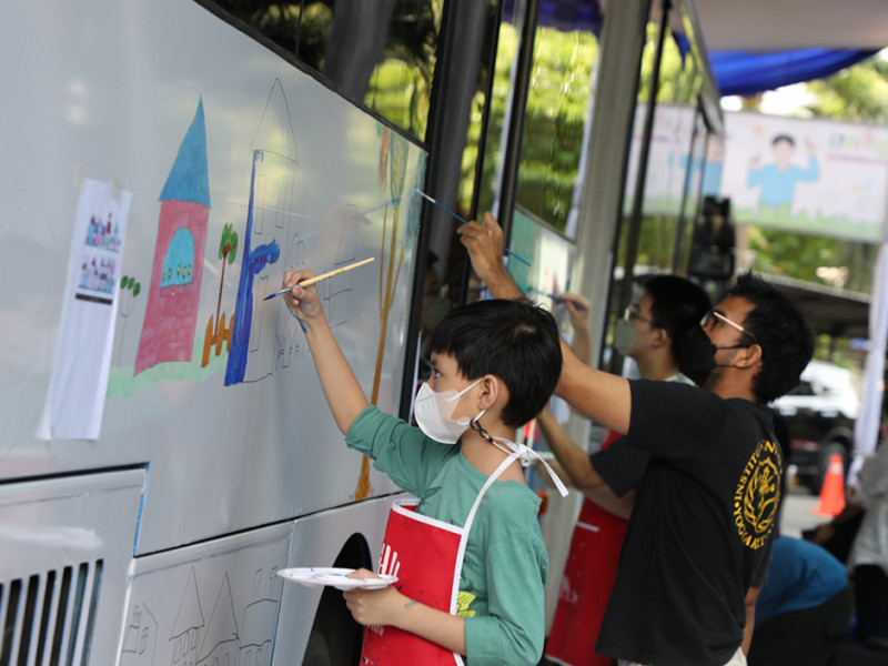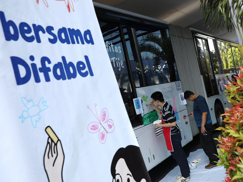 Dalam rangka menyambut Hari Disabilitas Internasional yang diperingati setiap tanggal 3 Desember, PT Transjakarta (Perseroda) mengajak 15 anak penyandang syndrome auitisme melukis satu unit bus gandeng Transjakarta. Kegiatan tersebut berlangsung di Kantor PT Transjakarta, Jalan Mayjen Sutoyo, Makasar, Jakarta Timur, Kamis (1/12). (Foto: Reza Hapiz/beritajakarta.id)