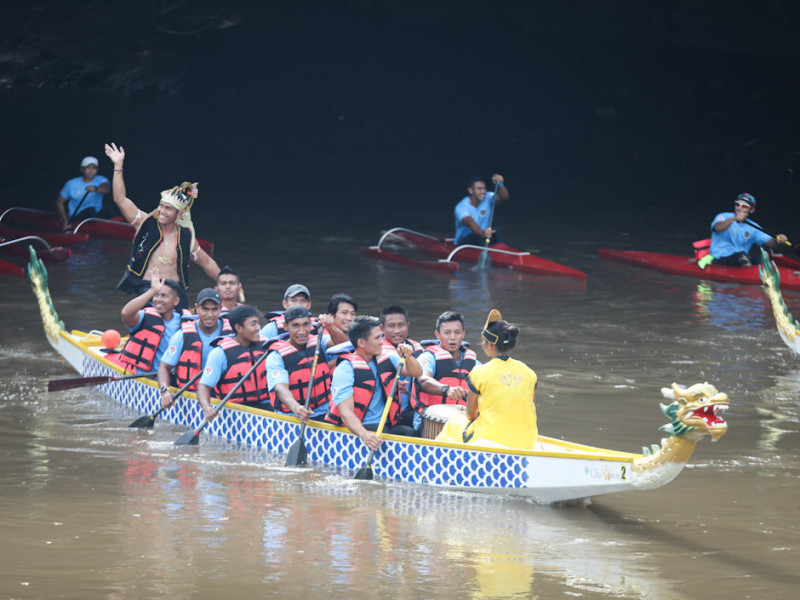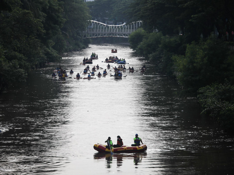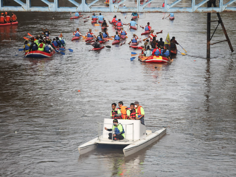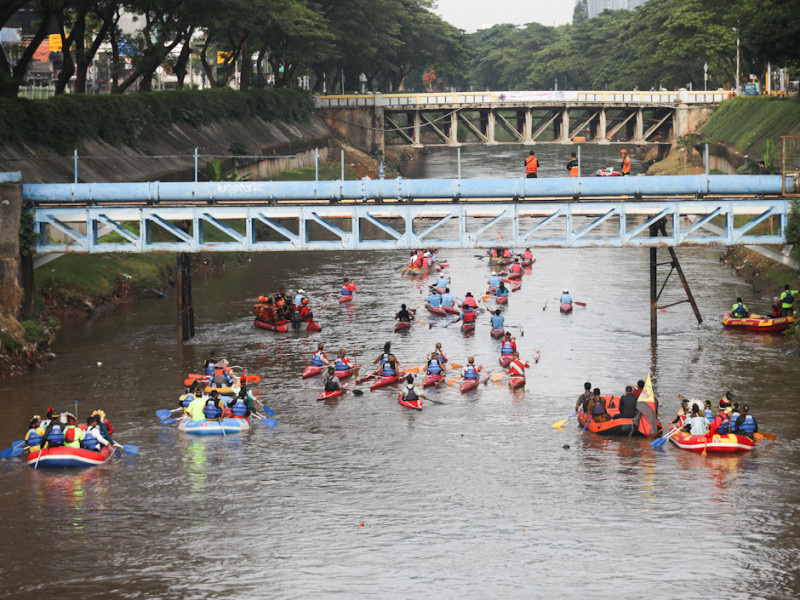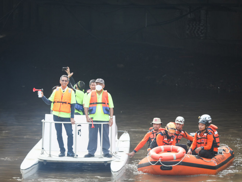 Penjabat (Pj) Gubernur DKI Jakarta, Heru Budi Hartono, dan Menteri Pekerjaan Umum dan Perumahan Rakyat (PUPR), Basuki Hadimuljono, mengikuti Festival Dayung Ciliwung di Sungai Ciliwung ruas Manggarai-Dukuh Atas, Jakarta Selatan, Minggu (4/12). Kegiatan ini digelar dalam rangka menuju Kejuaraan Nasional Dayung 2022 serta kampanye menjaga kebersihan Sungai Ciliwung. (Foto: Nugroho Sejati/beritajakarta.id)