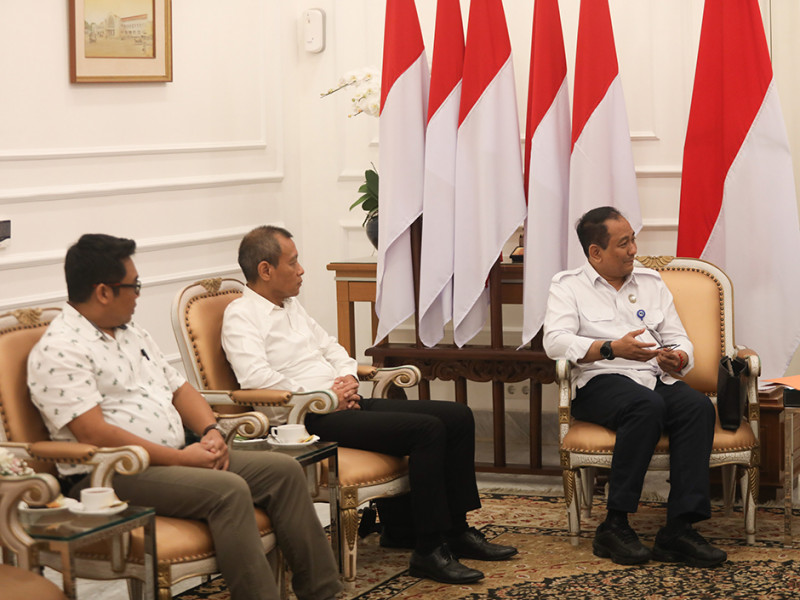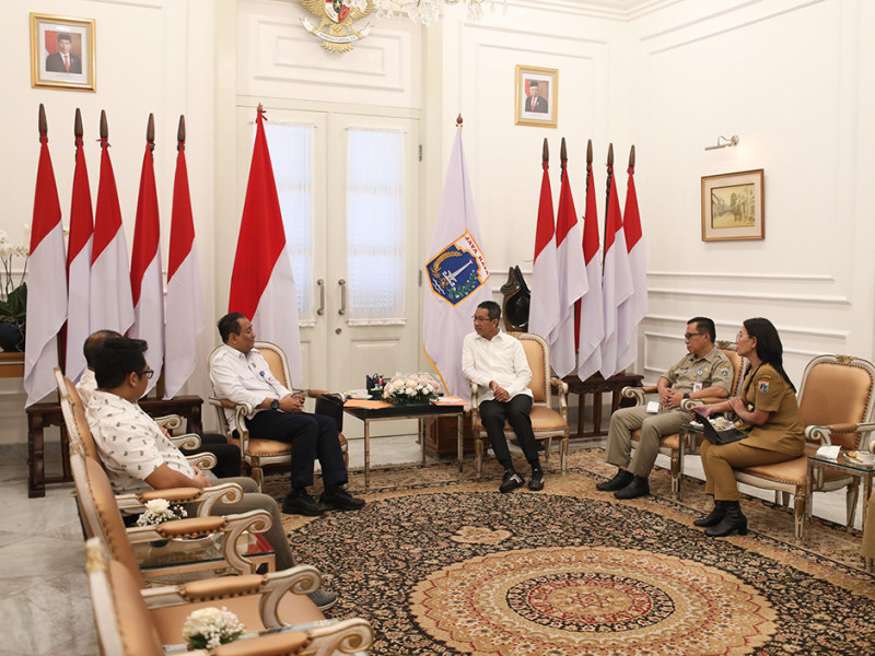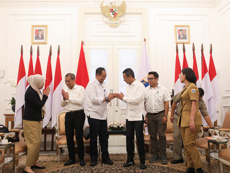 Penjabat (Pj) Gubernur DKI, Jakarta, Heru Budi Hartono, menerima kunjungan Direktur Utama Lembaga Penyiaran Publik Radio Republik Indonesia (LPP RRI), I Hendrasmo beserta jajaran di Ruang Tamu Utama, Balai Kota, Gambir, Jakarta Pusat, Senin (5/12). Kedatangan Dirut RRI beserta jajaran untuk membahas peran RRI sebagai jembatan komunikasi positif antara Pemprov DKI Jakarta dengan warganya. (Foto: Nugroho Sejati/beritajakarta.id)