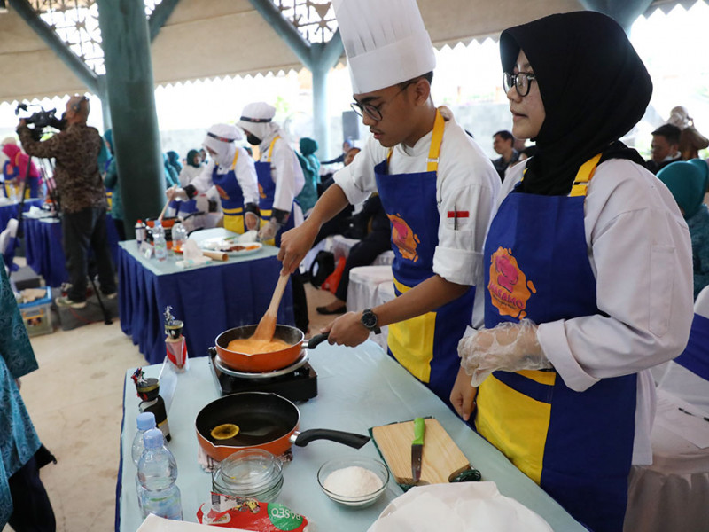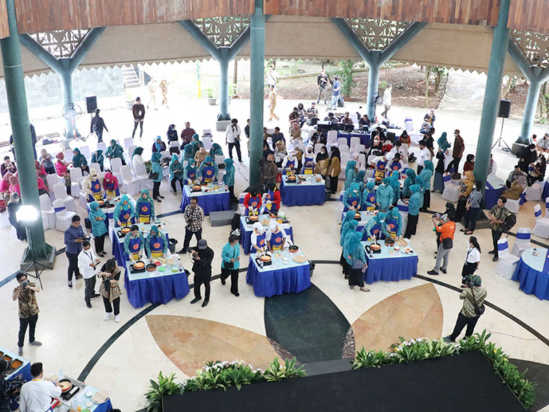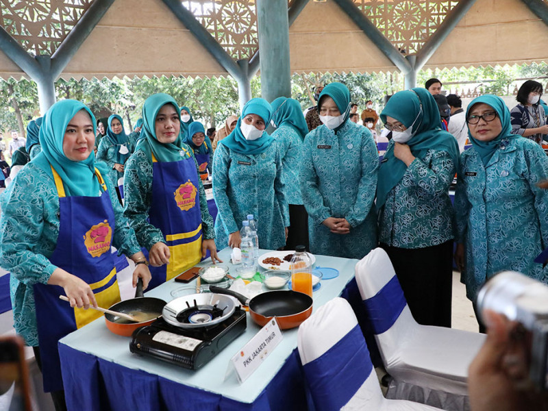 Kader Pemberdayaan dan Kesejahteraan Keluarga (PKK) dari lima wilayah kota mengikuti kompetisi memasak yang diinisiasi Kementerian Pariwisata dan Ekonomi Kreatif (Kemenparekraf) RI. Lomba memasak ini diadakan di Perkampungan Budaya Betawi Setu Babakan, Jagakarsa, Jakarta Selatan, Selasa (13/12).(Foto: Mochamad Tresna Suheryanto/beritajakarta.id)