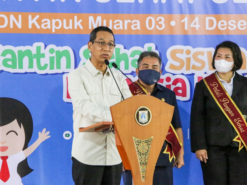 Penjabat (Pj) Gubernur DKI Jakarta, Heru Budi Hartono melakukan pencanangan Sertifikasi Kantin Sehat Sekolah di SDN 03 Kapuk Muara, Penjaringan, Jakarta Utara, Rabu (14/12). Kantin sehat sekolah ini penting untuk melindungi serta mewujudkan kebutuhan gizi yang cukup untuk peserta didik. (Foto: Mochamad Tresna Suheryanto/beritajakarta.id)