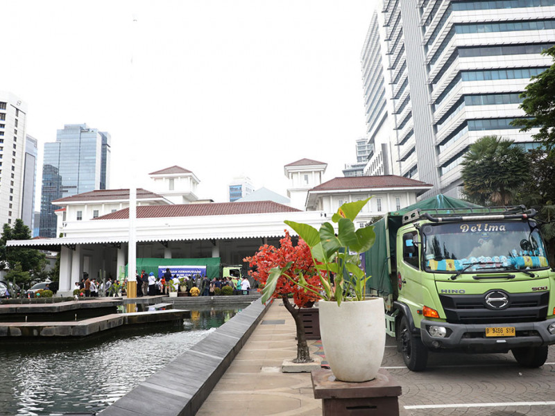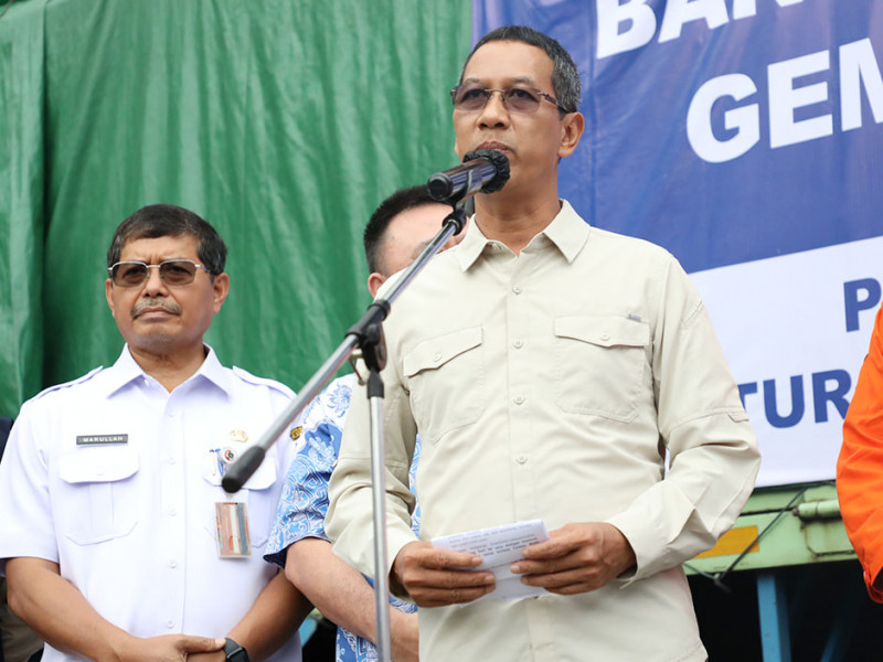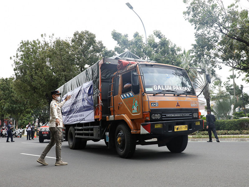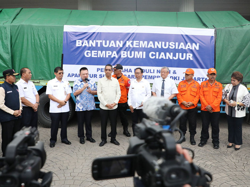 Penjabat (Pj) Gubernur DKI Jakarta, Heru Budi Hartono, melepas keberangkatan truk berisi bantuan kemanusiaan bagi penyintas gempa bumi Cianjur, Jawa Barat. Prosesi pelepasan keberangkatan dilakukan di halaman Pendopo Balai Kota DKI Jakarta, Rabu (14/12).(Foto: Mochamad Tresna Suheryanto/beritajakarta.id)