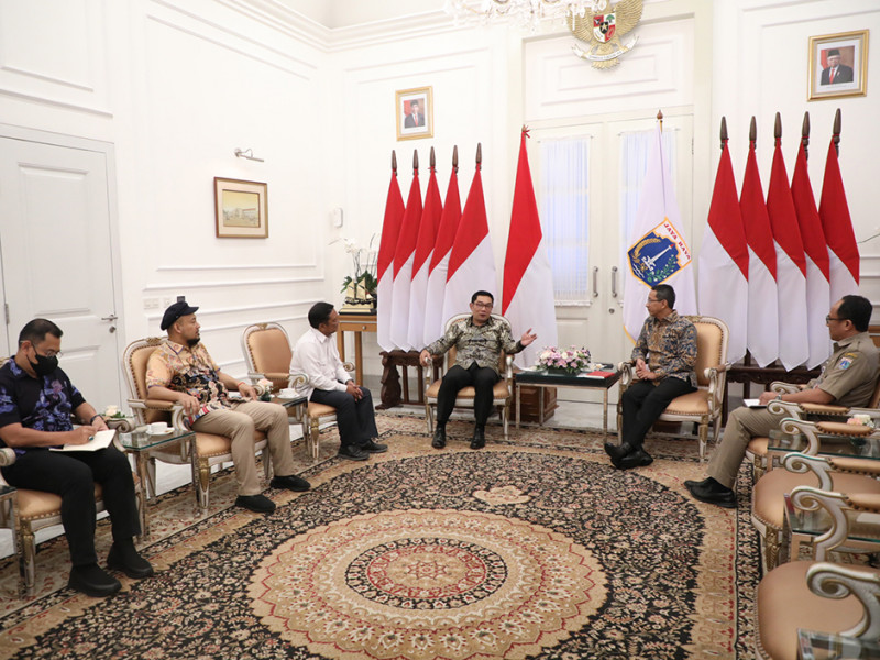 Penjabat (Pj) Gubernur DKI Jakarta, Heru Budi Hartono menerima kunjungan kerja Gubernur Jawa Barat, Ridwan Kamil beserta jajaran, di Balai Kota DKI Jakarta, Selasa (20/12). Pertemuan ini dalam rangka silaturahmi sekaligus membahas sejumlah program kerja sama antara Pemprov DKI Jakarta dengan Pemprov Jawa Barat. (Foto: Reza Hapiz/beritajakarta.id)