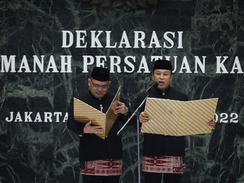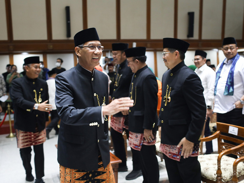Penjabat (Pj) Gubernur DKI Jakarta, Heru Budi Hartono, menyaksikan serta menandatangani deklarasi Majelis Amanah Persatuan Kaum Betawi di Balai Agung, Balai Kota DKI Jakarta, Gambir, Jakarta Pusat, Kamis (22/12). Deklarasi tersebut menyatukan dua organisasi Betawi, yaitu Badan Musyawarah (Bamus) Betawi dan Bamus Suku Betawi 1982. (Foto: Nugroho Sejati/beritajakarta.id)
