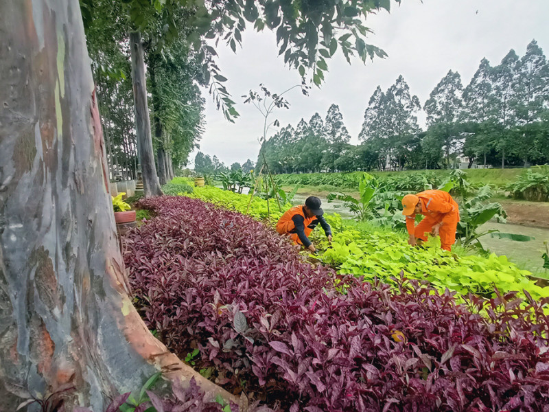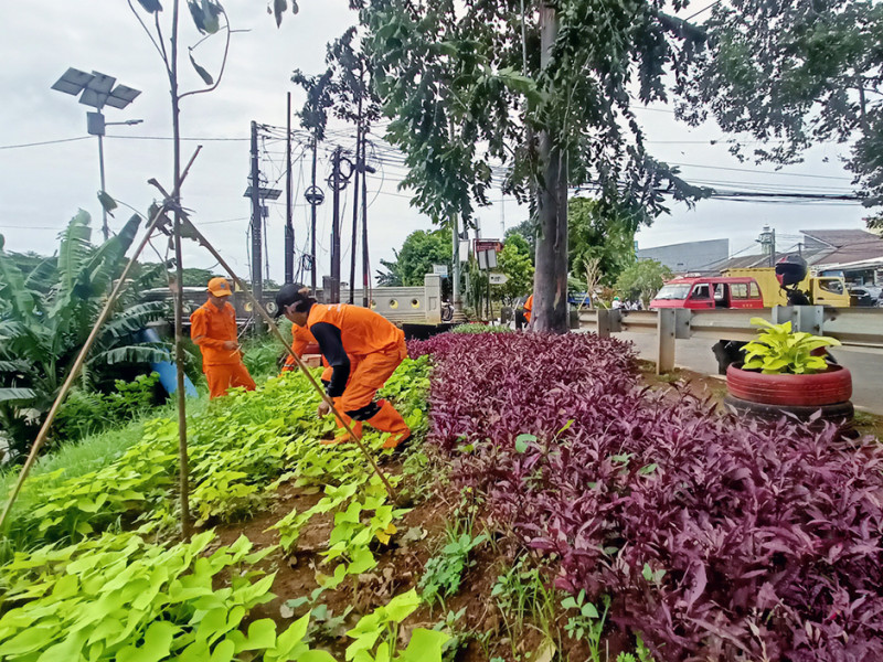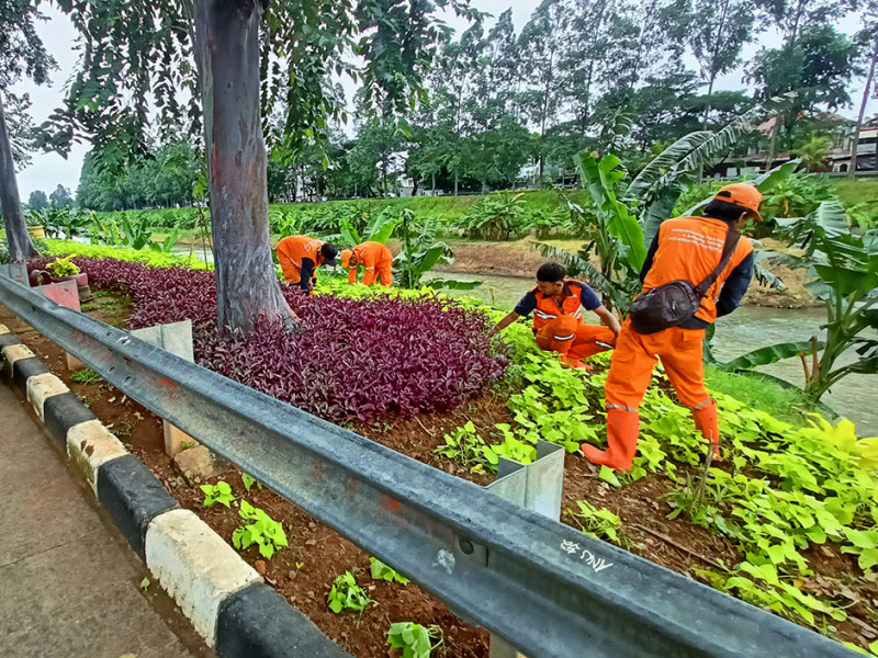 Petugas Penanganan Prasarana dan Sarana Umum (PPSU) Kelurahan Pondok Kopi melakukan penataan lahan kosong di Jalan Robusta Raya, kawasan Kanal Banjir Timur (KBT), Duren Sawit, Jakarta Timur. Lokasi tersebut ditata menjadi kawasan unggulan di Kelurahan Pondok Kopi. Penataan dilakukan agar kawasan menjadi lebih asri dan rapi. (Foto: Mochamad Tresna Suheryanto/beritajakarta.id)