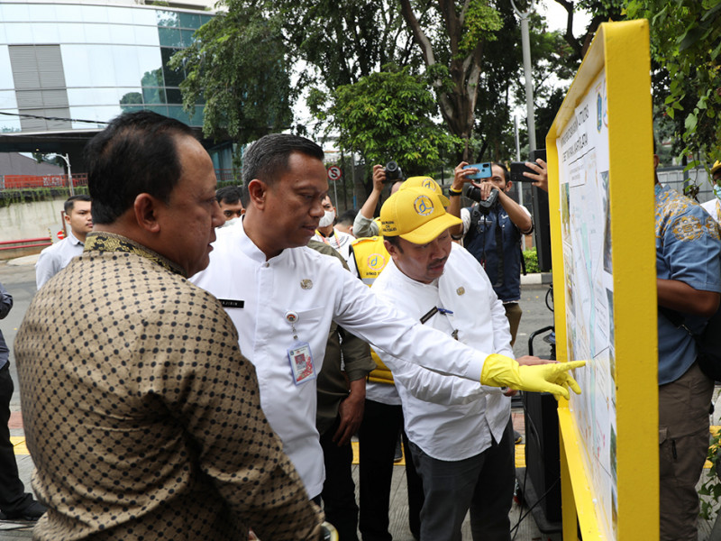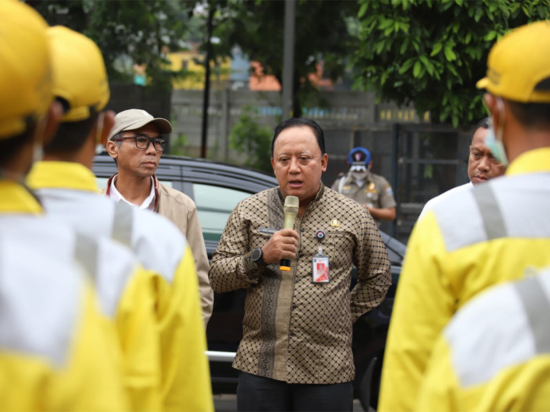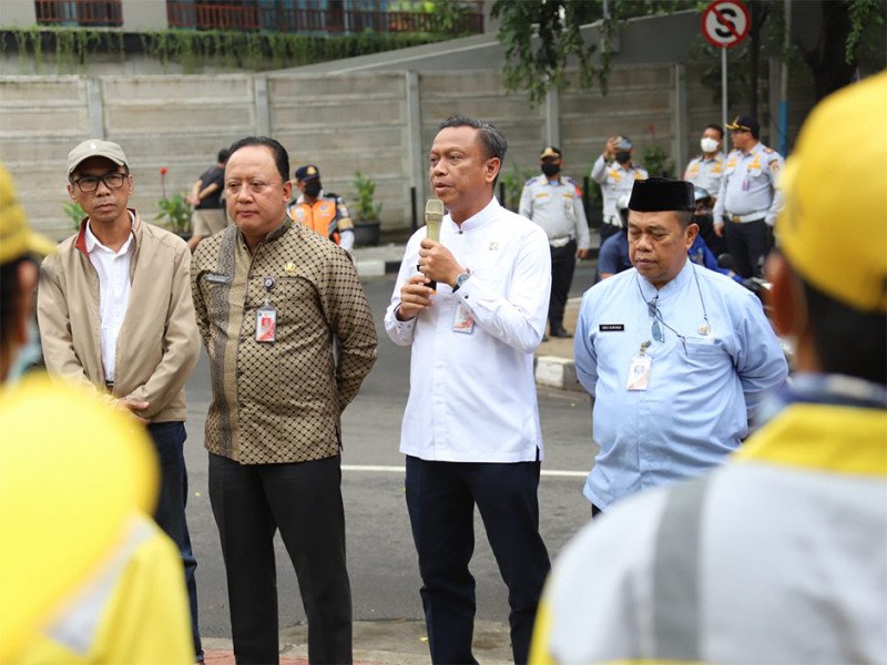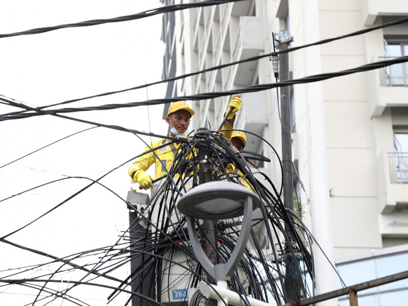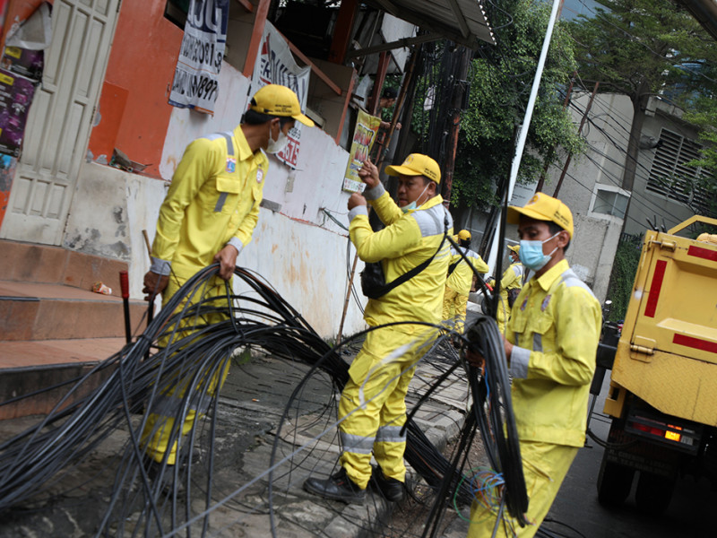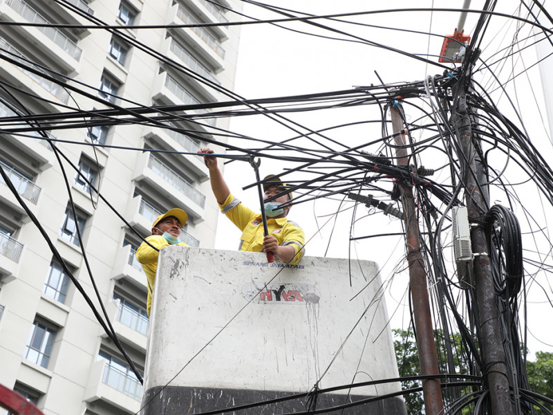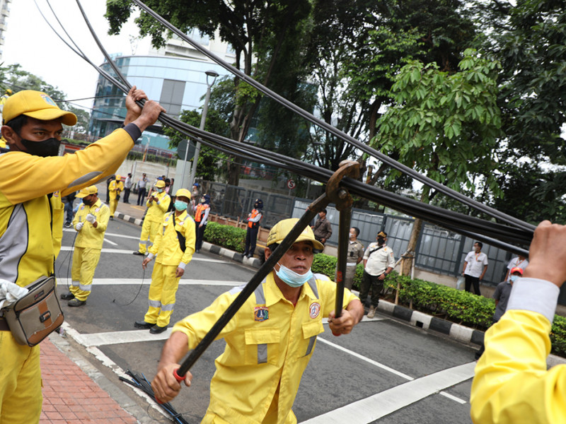 Dinas Bina Marga Provinsi DKI Jakarta melakukan pemotongan kabel udara semrawut di Jalan Tebet Timur Raya, Tebet, Jakarta Selatan, Jumat (30/12). Kegiatan ini untuk mendukung penyelenggaraan infrastruktur digital dan penataan Jakarta menuju Kota Pintar (Smart City) serta mewujudkan kerapian kota agar selaras dengan kaidah tata ruang, kelestarian dan estetika. Pemotongan kabel dipimpin langsung Kepala Dinas Bina Marga, Hari Nugroho bersama Wali Kota Jakarta Selatan, Munjirin. (Foto: Reza Hapiz/beritajakarta.id)