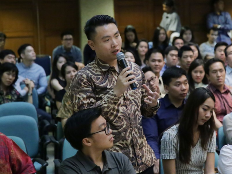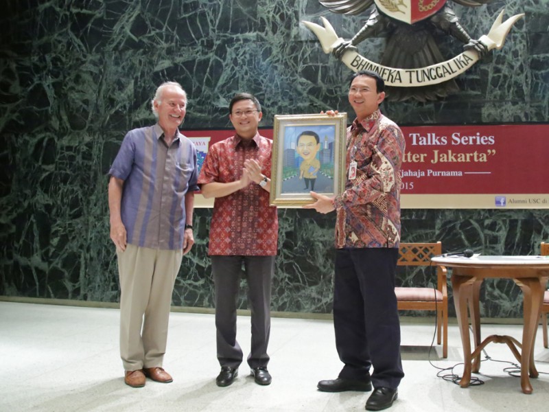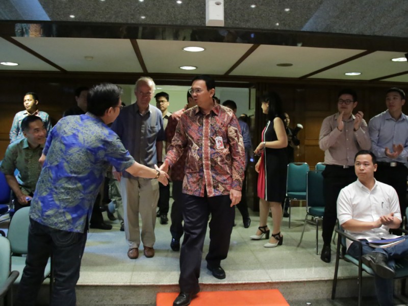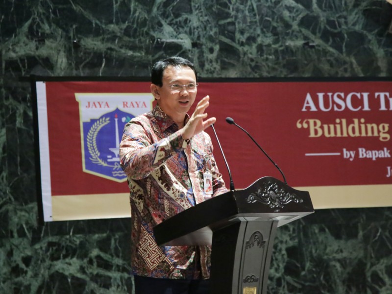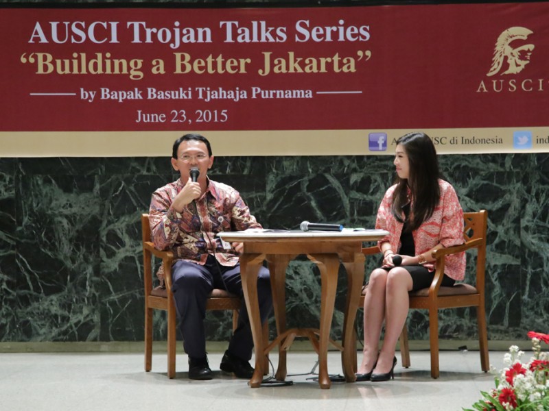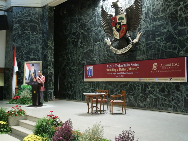 Gubernur DKI Jakarta, Basuki Tjahaja Purnama bertindak sebagai keynote speaker dalam pertemuan alumni University of Southern California Indonesia (AUSCI), bertajuk Trojan Talks Series, Building a Better Jakarta di Balaikota DKI Jakarta, Jalan Medan Merdeka Selatan, Gambir, Jakarta Pusat, Selasa (23/06/2015). (Foto: Yopie/beritajakarta.com)