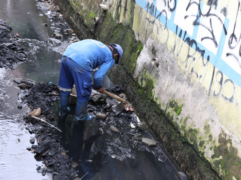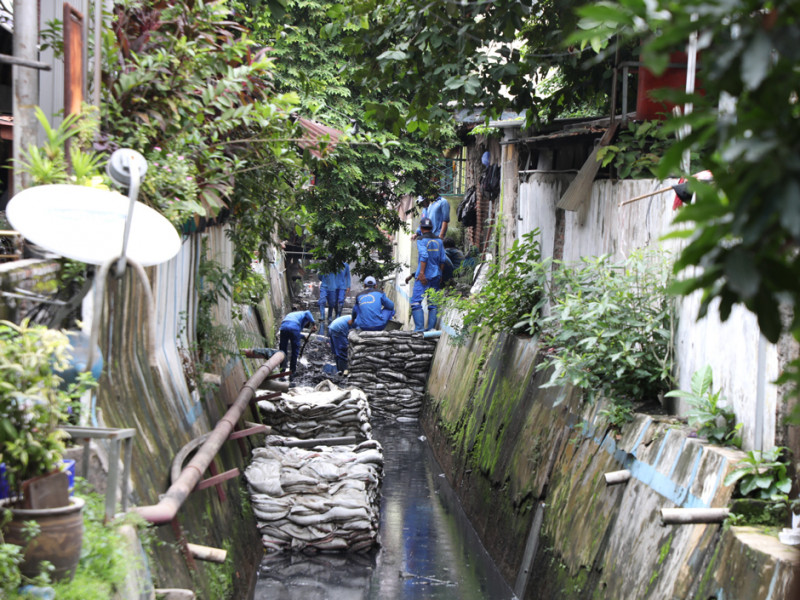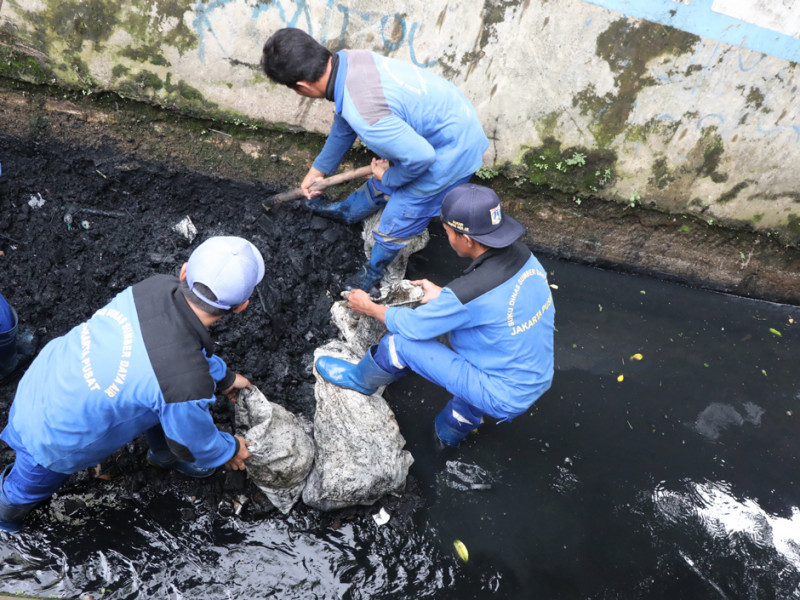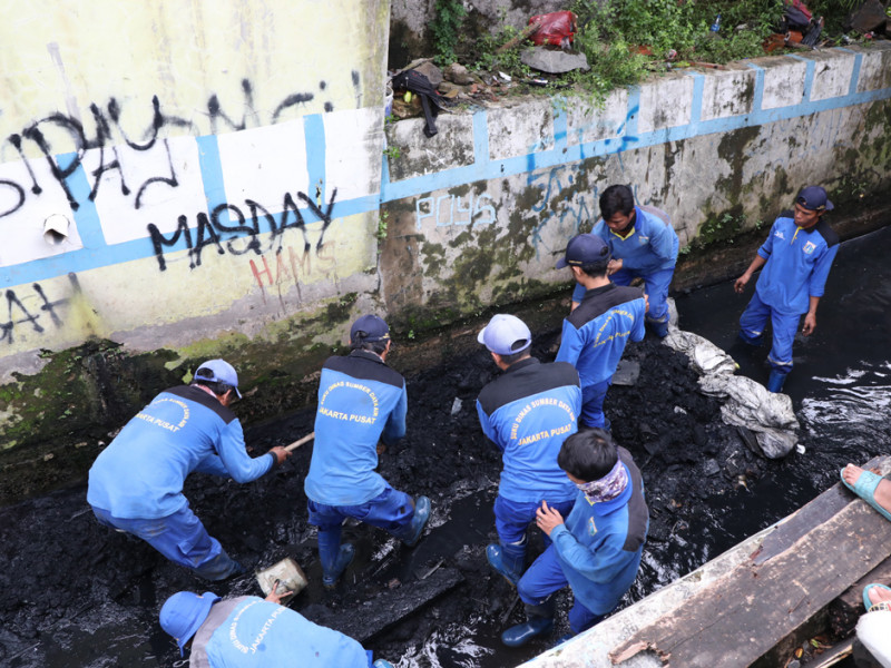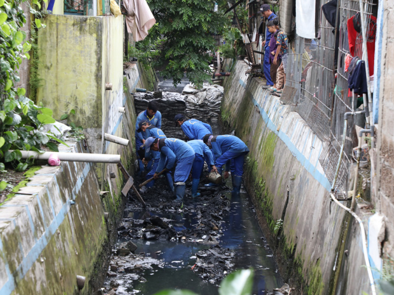 Petugas Suku Dinas Sumber Daya Air (Sudin SDA) Jakarta Pusat melakukan pengurasan saluran penghubung (Phb) Keroncong di Jalan Menteng Tenggulun RW 10, Kelurahan Menteng. Upaya ini dilakukan untuk meminimalisir terjadinya genangan. (Foto: Reza Hapiz/beritajakarta.id)
