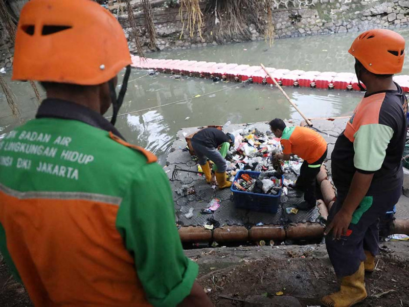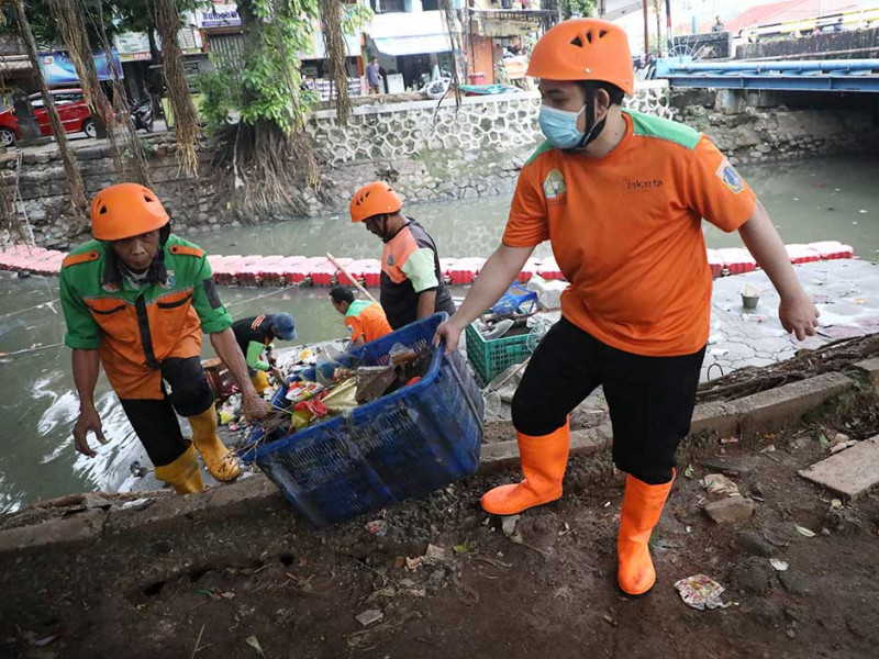 etugas Unit Penanganan Sampah Badan Air (UPSBA) Dinas Lingkungan Hidup DKI Jakarta berjibaku membersihkan sampah di sepanjang aliran Kali Sentiong, Paseban, Senen, Jakarta Pusat, Selasa (3/1). Dalam kegiatan kali ini, sebanyak 24 kubik sampah dari aliran kali Sentiong berhasil diangkut. (Foto: Mochamad Tresna Suheryanto/beritajakarta.id)