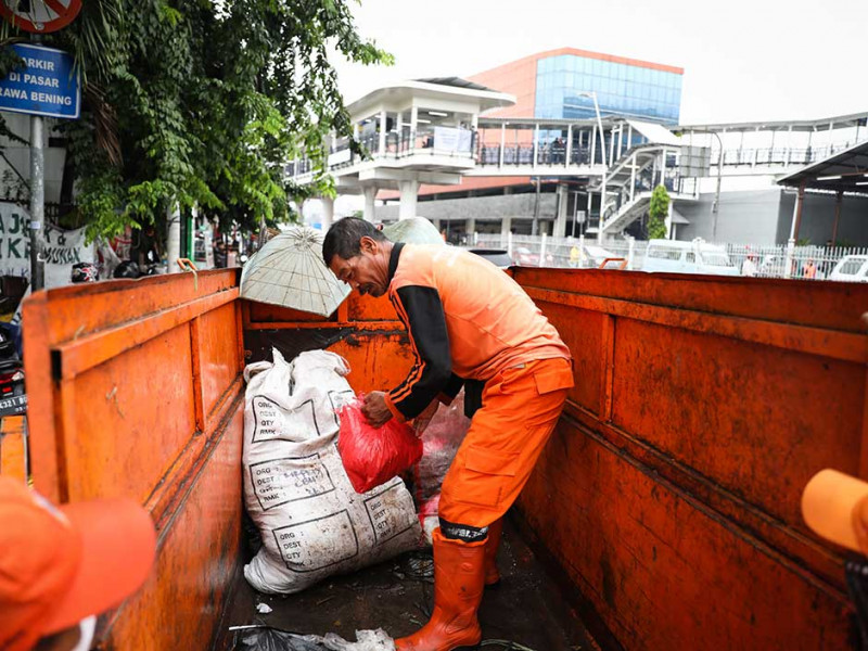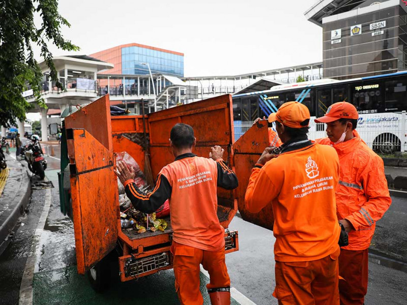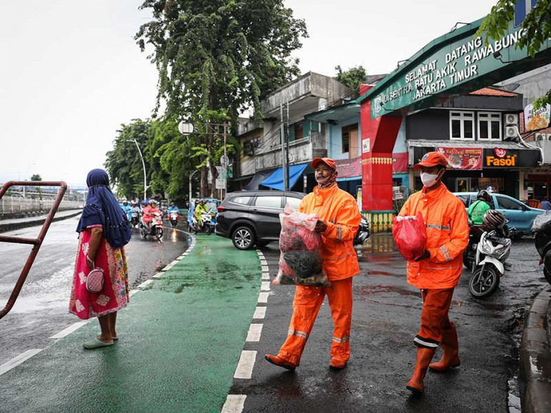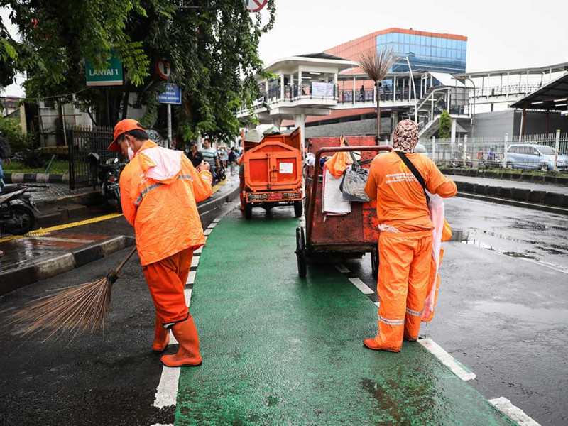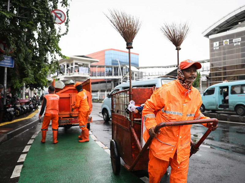 Petugas Penanganan Prasarana dan Sarana Umum (PPSU) Kelurahan Rawa Bunga membersihkan sampah di Jalan Bekasi Barat, Jatinegara, Jakarta Timur, Rabu (4/1). Pembersihan sampah tersebut untuk mencegah genangan di area sekitar Halte Transjakarta Jatinegara 2 dan Stasiun Kereta Api Jatinegara. (Foto: Nugroho Sejati/beritajakarta.id)