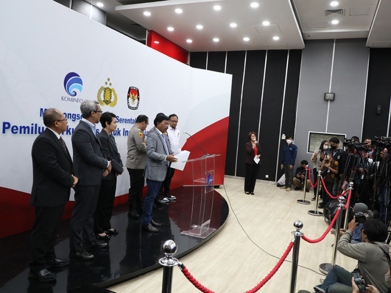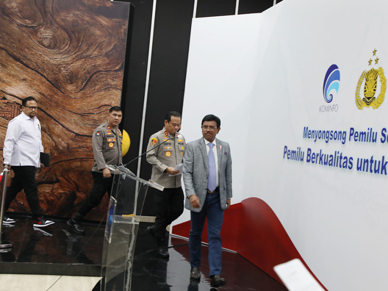 Kementerian Komunikasi dan Informatika (Kominfo) bersama Kepolisian Negara Republik Indonesia (POLRI) menggelar konferensi pers dalam rangka menjaga kondusivitas menjelang dan saat penyelenggaraan Pemilihan Umum (Pemilu) 2024. Upaya tersebut direalisasikan melalui penandatanganan nota kesepahaman (MoU) yang dilaksanakan di Ruang Media Center Kementerian Kominfo, Jalan Medan Merdeka Barat, Jakarta Pusat, Rabu (4/1). (Foto: Reza Hapiz/beritajakarta.id)