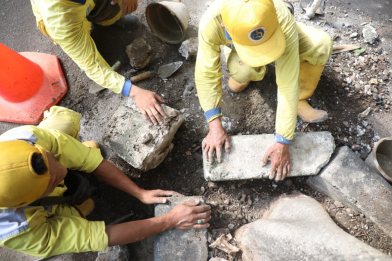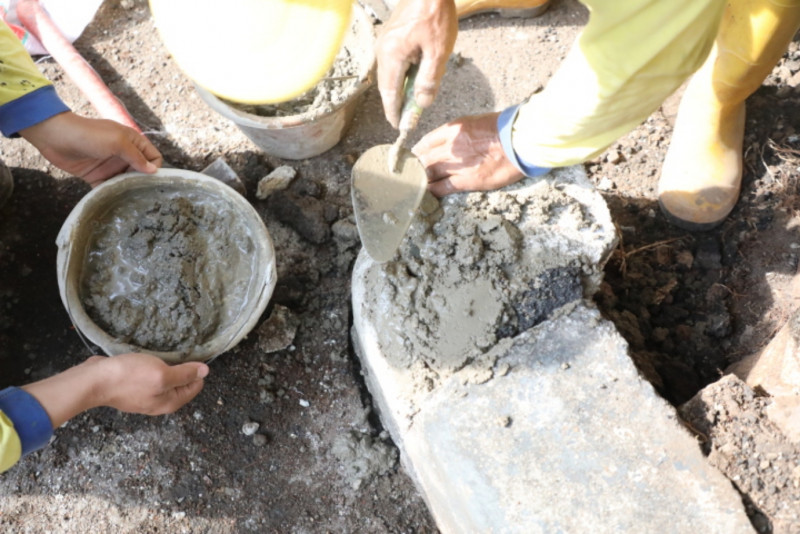 Petugas Satuan Pelaksana (Satpel) Bina Marga Kecamatan Menteng melakukan perbaikan jalan di Jl R.P. Soeroso, Gondangdia, Jakarta Pusat, Senin (9/1). Perbaikan jalan sepanjang 2,80 meter ini dilakukan untuk menambah kenyamanan pengguna jalan.(Photo: Mochamad Tresna Suheryanto/beritajakarta.id)
