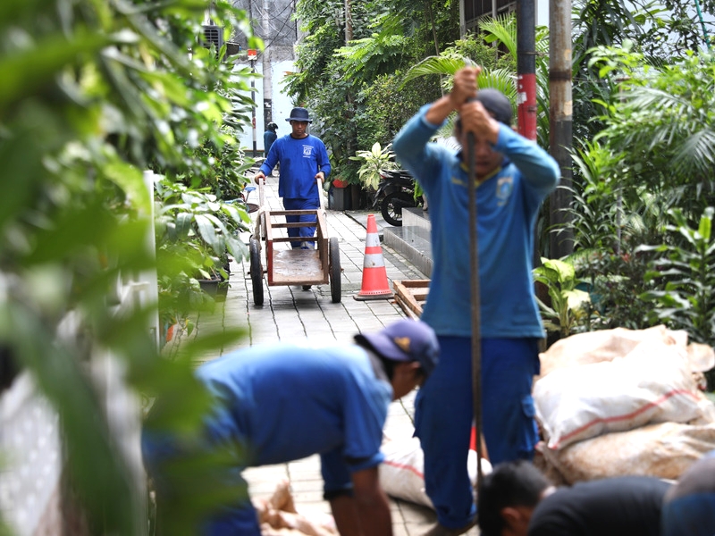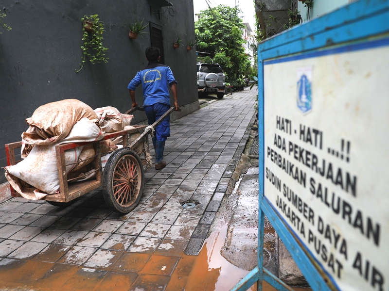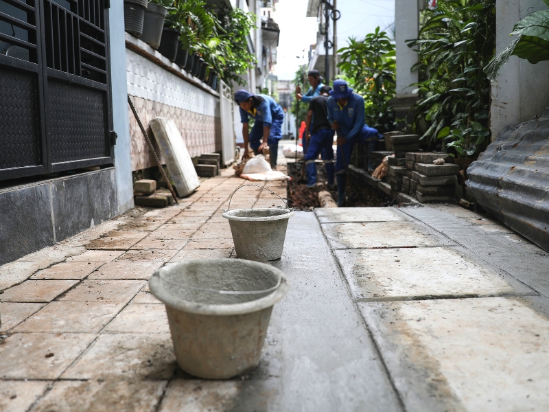 Petugas Suku Dinas Sumber Daya Air (Sudin SDA) Jakarta Pusat melakukan pengerjaan normalisasi saluran di Jalan Tambak II RT 04/05, Pegangsaan, Menteng, Jakarta Pusat, Selasa (10/1). Pembuatan saluran sepanjang 145 meter dengan lebar 40 sentimeter dan kedalaman 60 sentimeter dengan target dua minggu selesai. (Foto: Nugroho Sejati/beritajakarta.id)