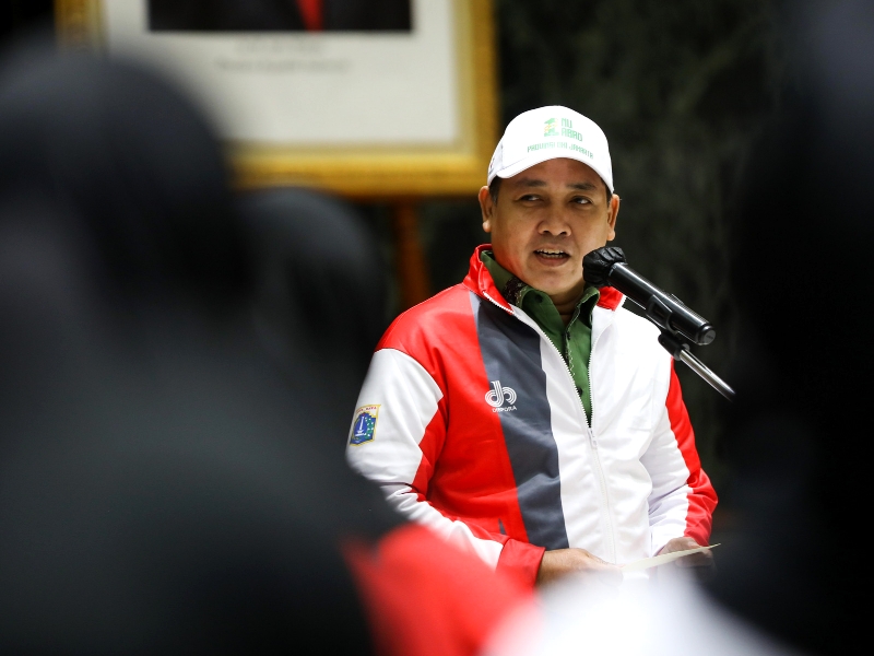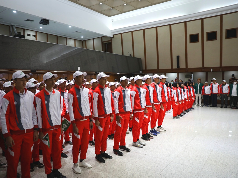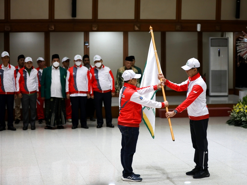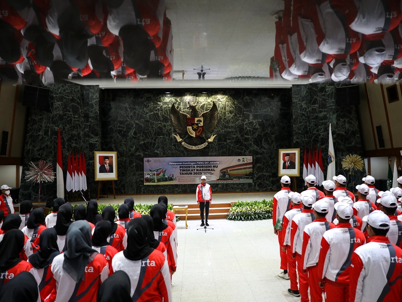 Penjabat (Pj) Gubernur DKI Jakarta, Heru Budi Hartono melepas 199 kontingen Pekan Olahraga dan Seni Nahdlatul Ulama (Porseni NU) DKI Jakarta Tahun 2023 di Balai Agung, Balai Kota DKI Jakarta, Rabu (11/1). Porseni NU Tingkat Nasional Tahun 2023 berlangsung di Surakarta, Jawa Tengah pada 14-22 Januari 2023 dengan mempertandingkan tujuh cabang olahraga (cabor) dan seni seperti sepak bola, bola voli, bulu tangkis, silat, MTQ, membaca kitab kuning dan menghafal alfiyah. (Foto: Nugroho Sejati/beritajakarta.id)