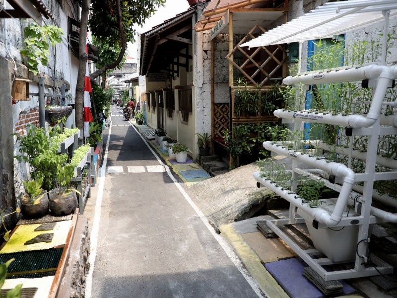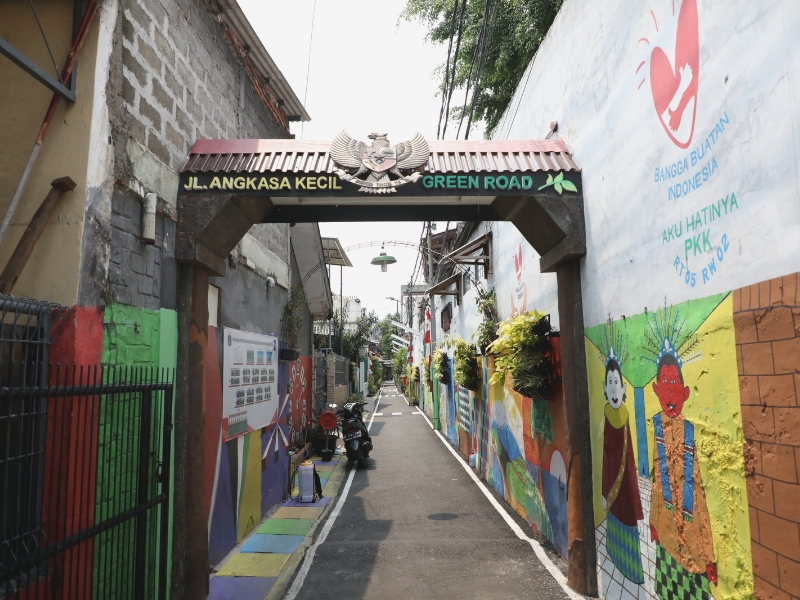 Jalan Angkasa Dalam Kecil RT 5/02 Kelurahan Gunung Sahari Selatan, Kemayoran, Jakarta Pusat, kini terlihat lebih rapi, hijau dan tertata, Kamis (12/1). Penataan kawasan sepanjang 150 meter dipercantik dengan berbagai macam mural dan penghijauan dengan berbagai macam tanaman produktif.(Photo:Mochamad Tresna Suheryanto/beritajakarta.id)