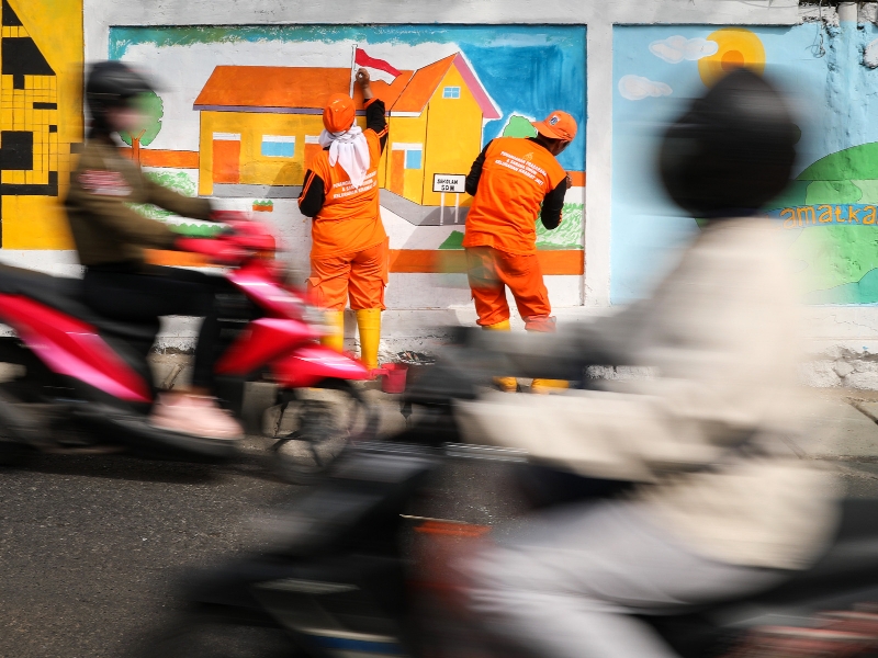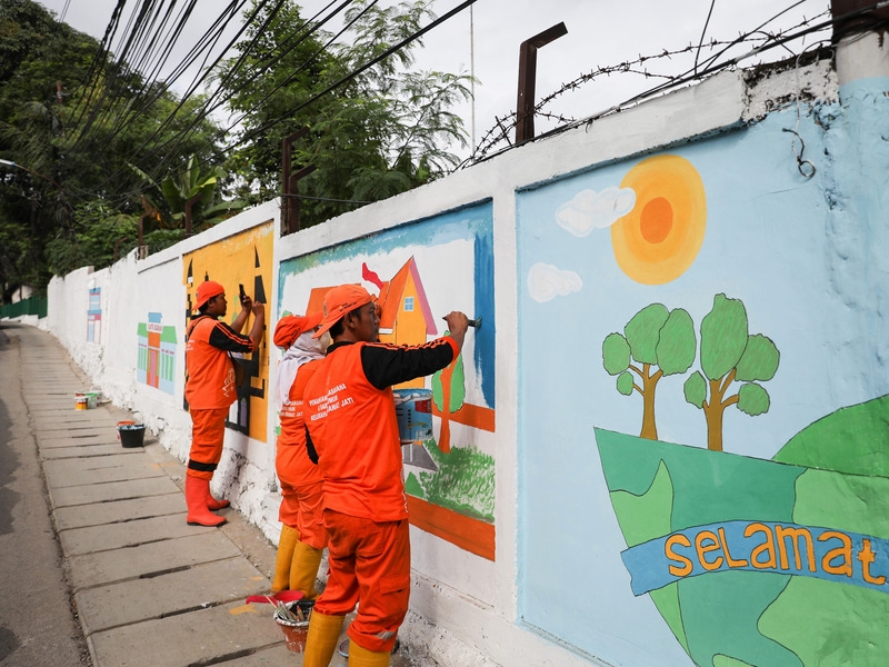 Sejumlah petugas Penanganan Prasarana dan Sarana Umum (PPSU) Kelurahan Kramat Jati melukis mural di tembok sepanjang Jalan Kerja Bakti, Kecamatan Kramat Jati, Jakarta Timur, Selasa (17/1). Mural bertema suasana lingkungan Kramat Jati tersebut mempercantik tembok sepanjang 400 meter dan ditargetkan selesai pada awal bulan Februari 2023. (Foto: Nugroho Sejati/beritajakarta.id)