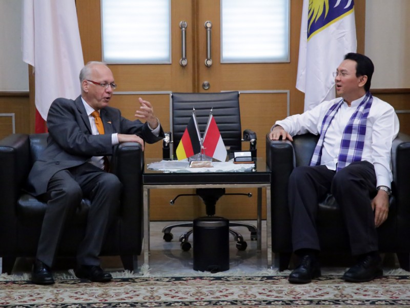 Gubernur DKI Jakarta, Basuki Tjahaja Purnama menerima kunjungan Duta Besar (Dubes) Jerman untuk Indonesia Georg Witschel, di Balaikota DKI Jakarta, Jalan Medan Merdeka Selatan, Gambir, Jakarta Pusat, Jumat (26/06/2015). Dalam kesempatan tersebut Georg Witschel menyampaikan kepada Basuki perihal persiapan German Season yang akan diselenggarakan di kawasan Monas. (Foto : Yopie/ Beritajakarta.com)