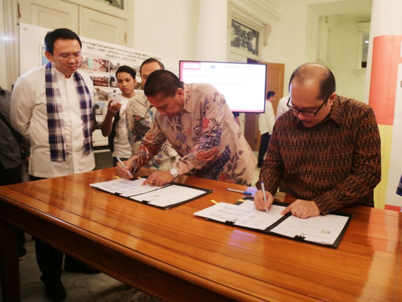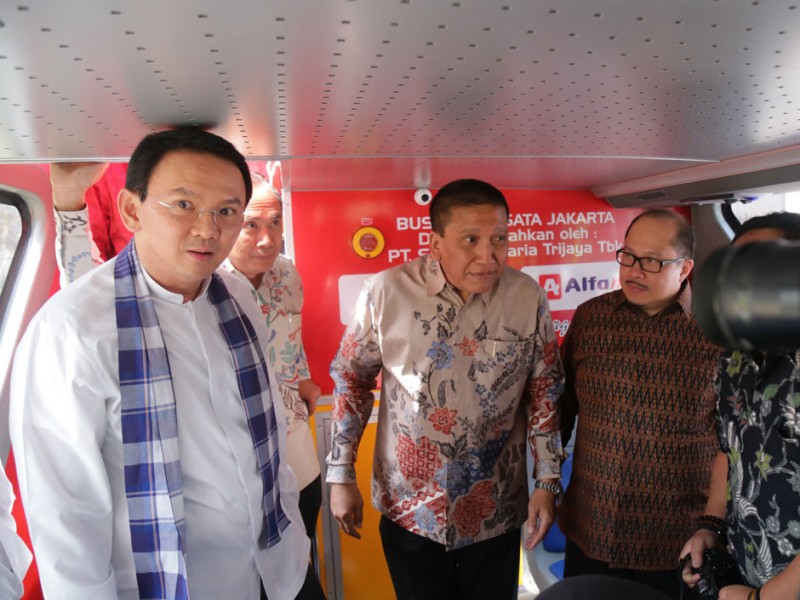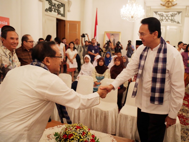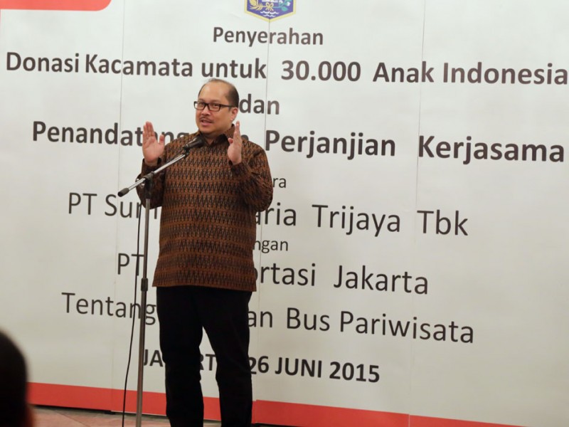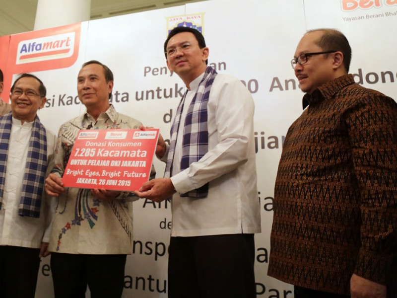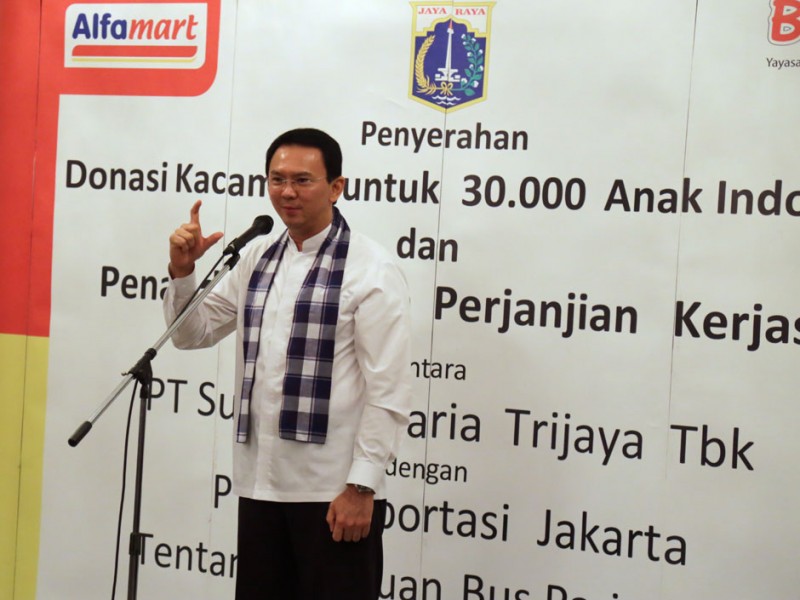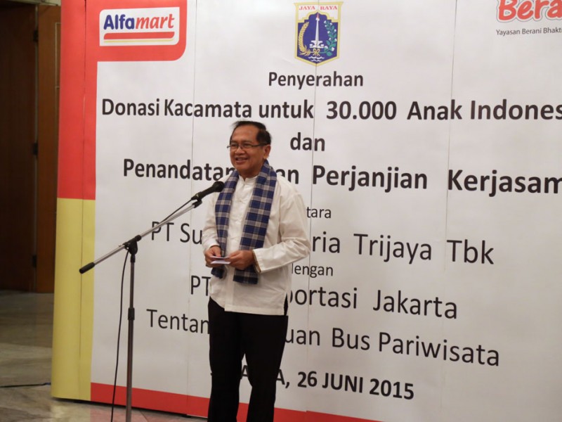 Gubernur DKI Jakarta, Basuki Tjahaja Purnama menyerahkan secara simbolis bantuan kacamata untuk 30 ribu anak-anak di Balaikota DKI Jakarta, Jalan Medan Merdeka Selatan, Gambir, Jakarta Pusat, Jumat (26/06/2015). Dalam kesempatan tersebut, Basuki juga menyaksikan penandatanganan perjanjian kerjasama bantuan bus tingkat wisata dari PT Alfaria Trijaya kepada PT Transportasi Jakarta (Transjakarta).(Foto: Reza/beritajakarta.com)