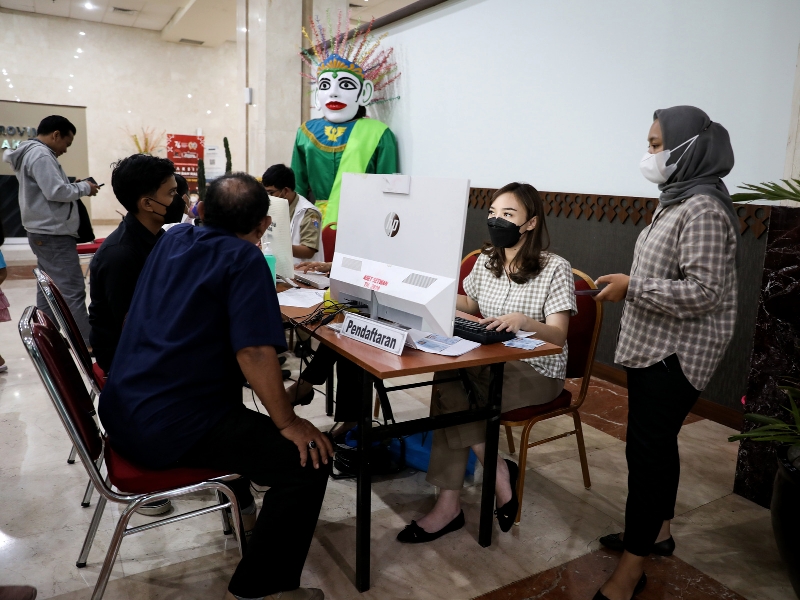 Sejumlah warga menjalani vaksinasi booster (penguat) dosis kedua COVID-19 di Lobi Gedung DPRD DKI Jakarta, Gambir, Jakarta Pusat, Selasa (24/1). Vaksinasi booster dosis kedua tersedia untuk warga berusia 18 tahun ke atas yang telah melewati masa 6 bulan setelah vaksinasi booster dosis pertama. (Foto: Nugroho Sejati/beritajakarta.id)