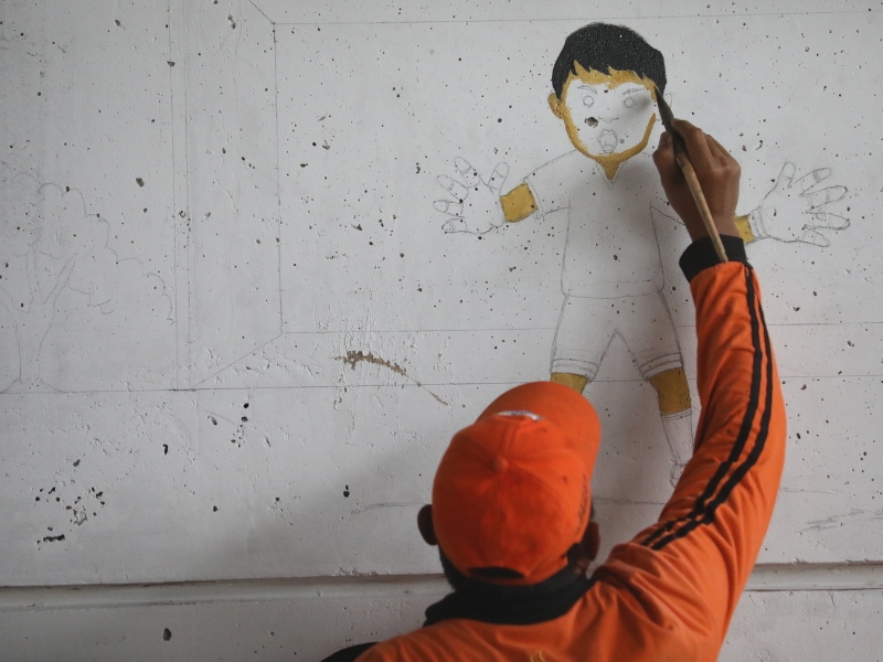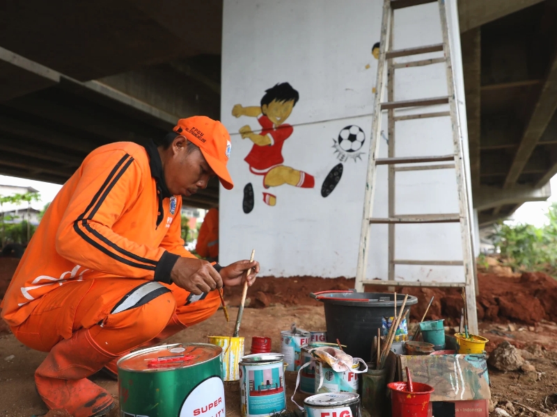 Petugas Penanganan Prasarana dan Sarana Umum (PPSU) Kelurahan Cipinang Melayu, Makasar, Jakarta Timur mempercantik Kolong Tol Becakayu di wilayah RW 01, dengan mural, Kamis (26/1). Pembuatan mural merupakan bagian dari kawasan unggulan Cipinang Melayu dengan tema penghijauan dan olahraga, mural ini dikerjakan sejak Desember lalu dan ditargetkan rampung pada Februari nanti.(Photo: Mochamad Tresna Suheryanto/beritajakarta.id)
