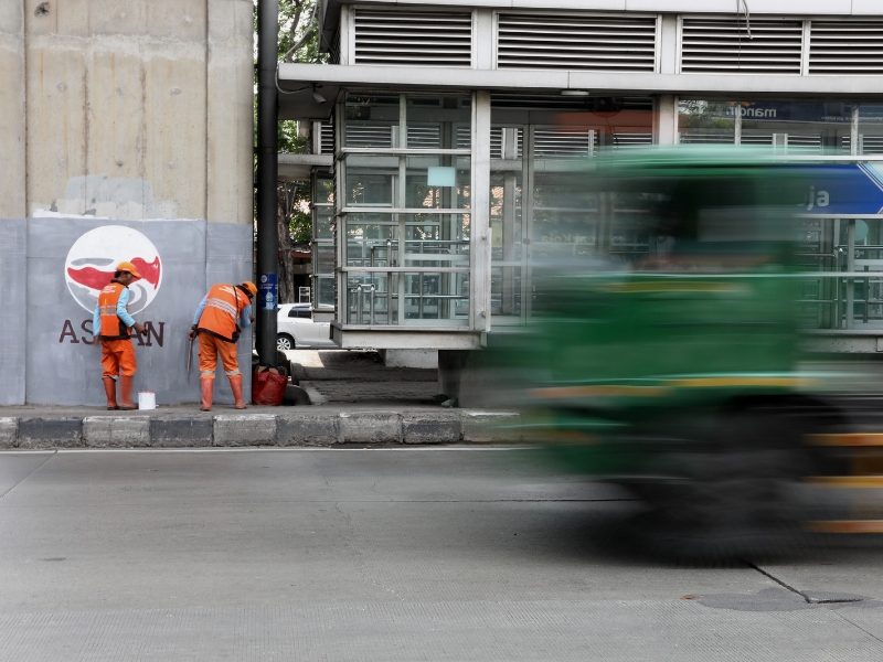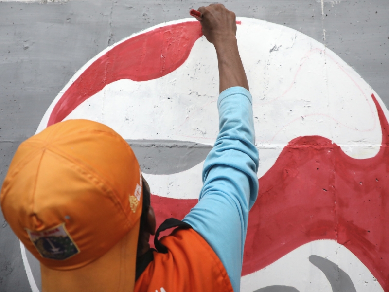 Petugas Penanganan Prasarana dan Sarana Umum (PPSU) Kelurahan Rawa Badak Utara mengecat tiang-tiang bergambarkan lambang ASEAN di kolong Tol Pelabuhan, Jalan Yos Sudarso, Koja, Jakarta Utara, Jumat (27/1). Pengecatan ini dilakukan untuk mempercantik kawasan serta penyambutan para delegasi Konferensi Tingkat Tinggi (KTT) di Jakarta tahun ini.(Photo: Mochamad Treana Suheryanto/beritajakarta.id)