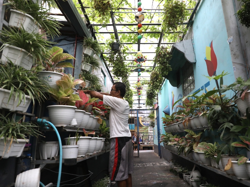 Melihat gang hijau yang dibuat Kelompok Tani (Poktan) Ampar Adhum di Jalan Bekasi Timur IV, RT08/8, Cipinang Besar Utara, Jatinegara, Jakarta Timur yang semakin hijau dan asri, Jumat (27/1). Gang hijau sepanjang 700 meter ini ditanami beragam tanaman berjenis sayuran, merambat dan hias membuat lingkungan terasa sedap dipandang.(Photo: Mochamad.Tresna Suheryanto/ Beritajakarta.id)