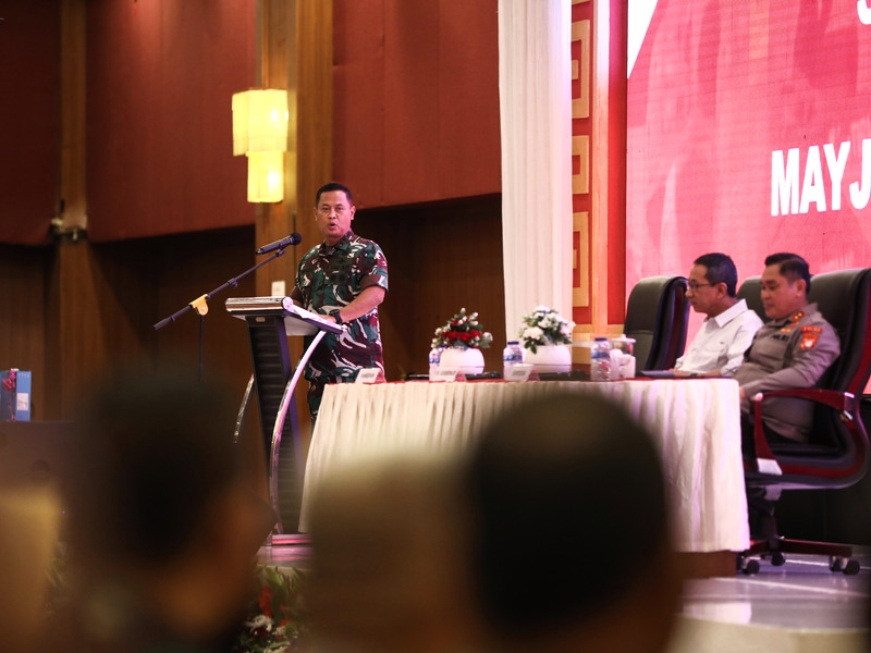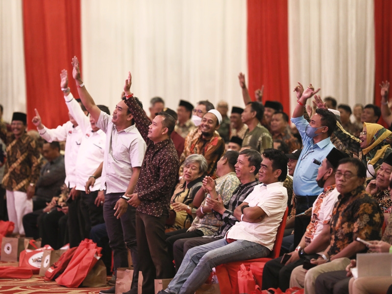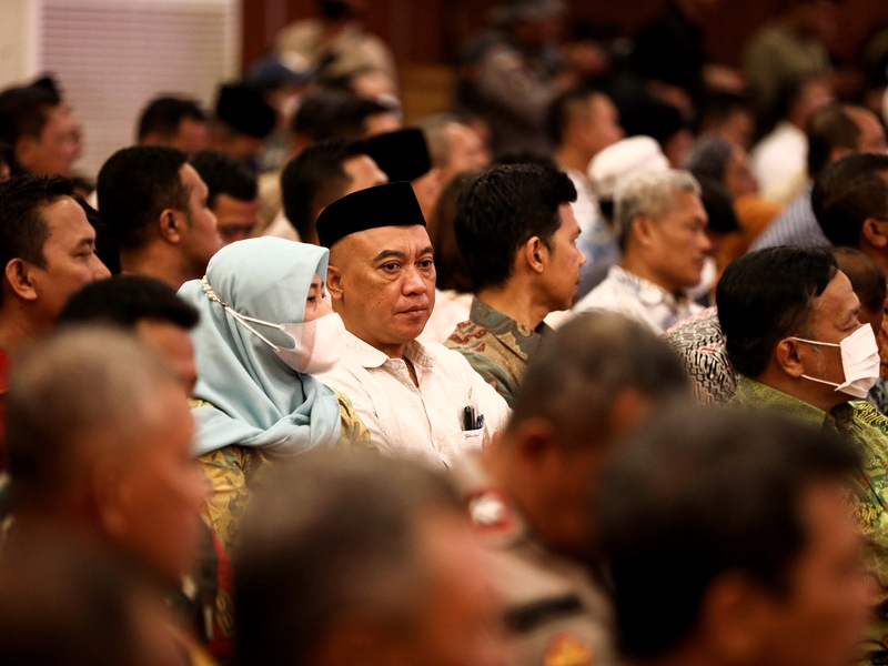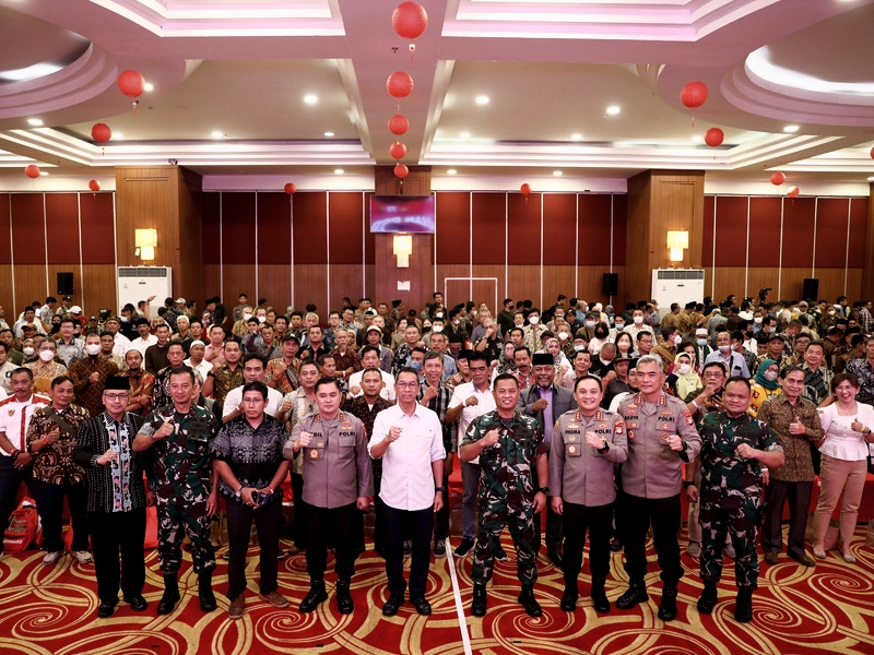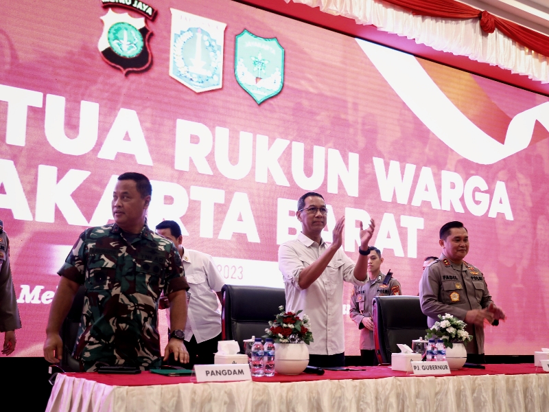 Penjabat (Pj) Gubernur DKI Jakarta, Heru Budi Hartono bersama Kapolda Metro Jaya, Irjen Pol Muhammad Fadil Imran, dan Panglima Kodam Jaya, Mayjen TNI Untung Budiharto, menghadiri acara Guyub Ketua Rukun Warga (RW) se-Jakarta Barat di Grand Ballroom Hao Di Fang Seasons City, Tambora, Jakarta Barat, Sabtu (4/2). Pj Gubernur berharap semua pihak, termasuk pengurus RT/RW, dapat bersinergi dengan Forum Komunikasi Pimpinan Daerah (Forkopimda) sebagai upaya menurunkan angka kemiskinan ekstrem dan stunting. (Foto: Nugroho Sejati/beritajakarta.id)