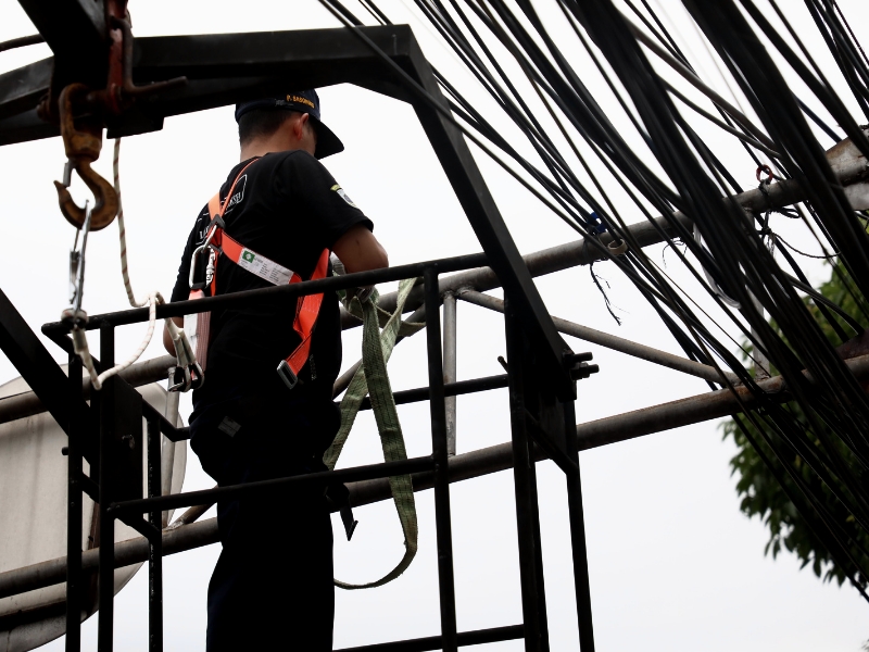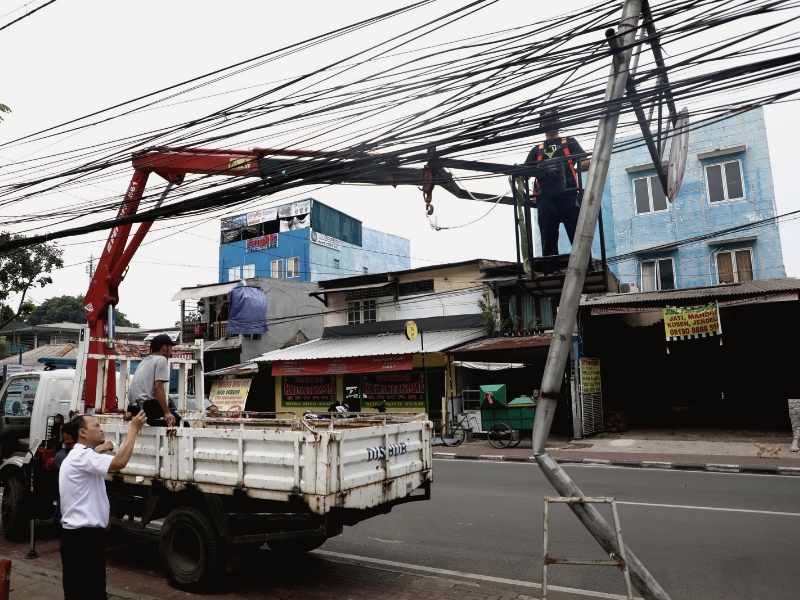 Enam personel dan satu unit truk crane dikerahkan Suku Dinas Perhubungan (Sudinhub) Jakarta Selatan untuk mengevakuasi tiang rambu lalu lintas leter S yang rusak di Jalan RC Veteran, Bintaro, Pesanggrahan, Senin (6/2). Evakuasi dilakukan karena tiang lalu lintas sudah miring dan bengkok akibat ditabrak mobil pada hari minggu kemarin.(Foto: Mochamad Tresna Suheryanto/beritajakarta.id)