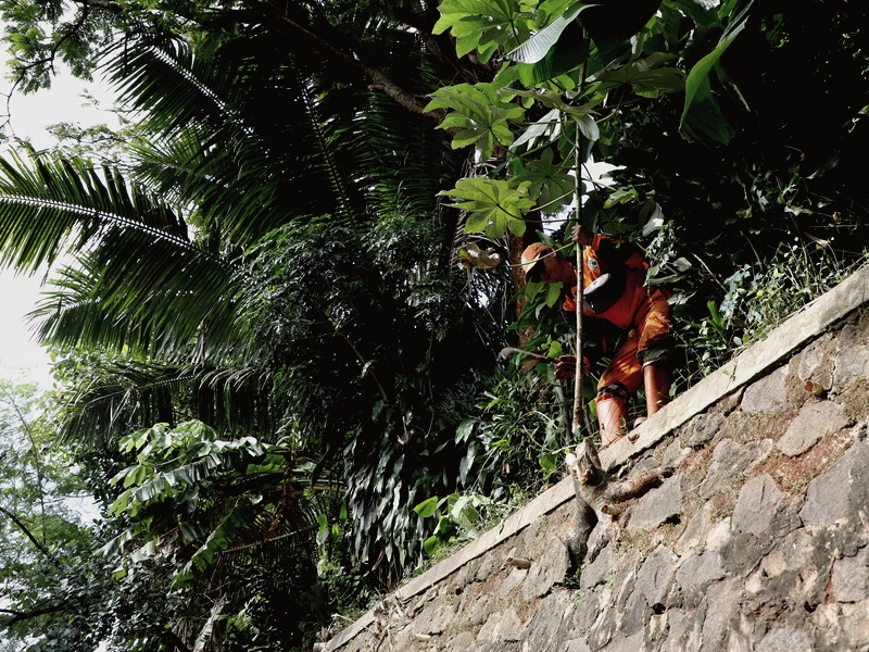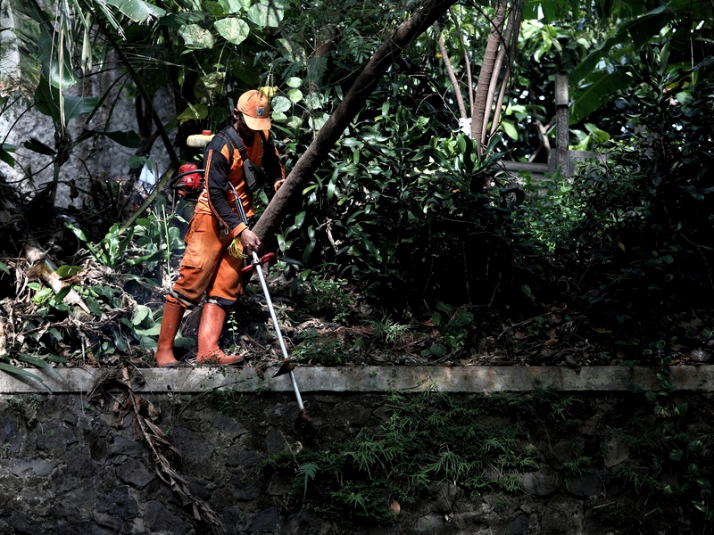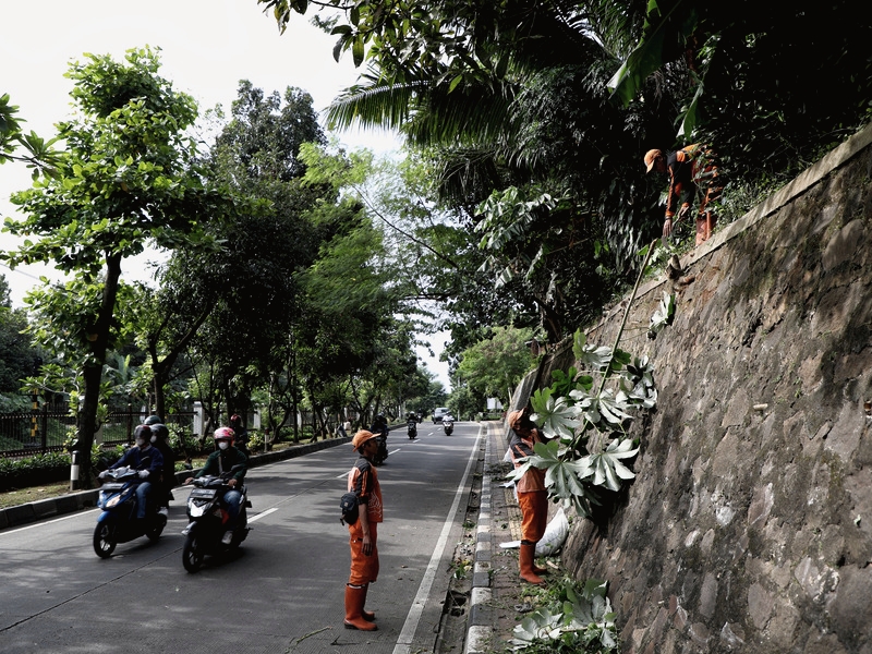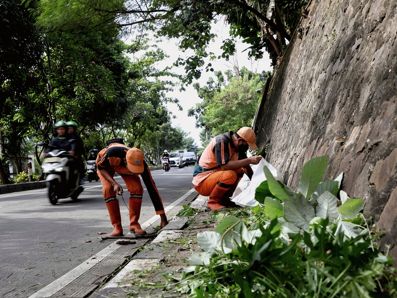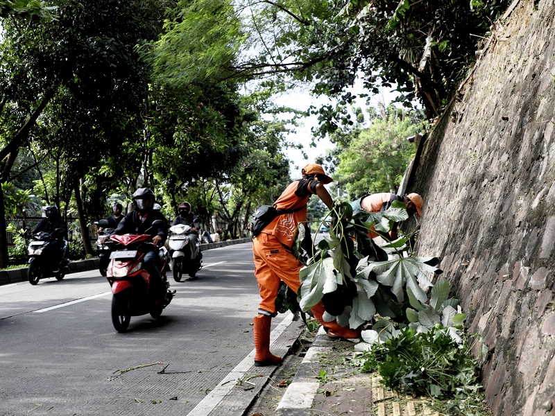 Petugas Penanganan Prasarana dan Sarana Umum (PPSU) Srengseng Sawah membersihkan tanaman liar di sisi Jalan Lenteng Agung Raya, Jagakarsa, Jakarta Selatan, Selasa (7/2). Upaya itu dilakukan guna menjaga agar jalan tetap terlihat bersih dan rapi demi kenyamanan pengendara yang melintasi kawasan tersebut. (Foto:Andri Widiyanto/beritajakarta.id)
