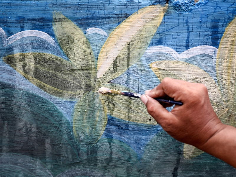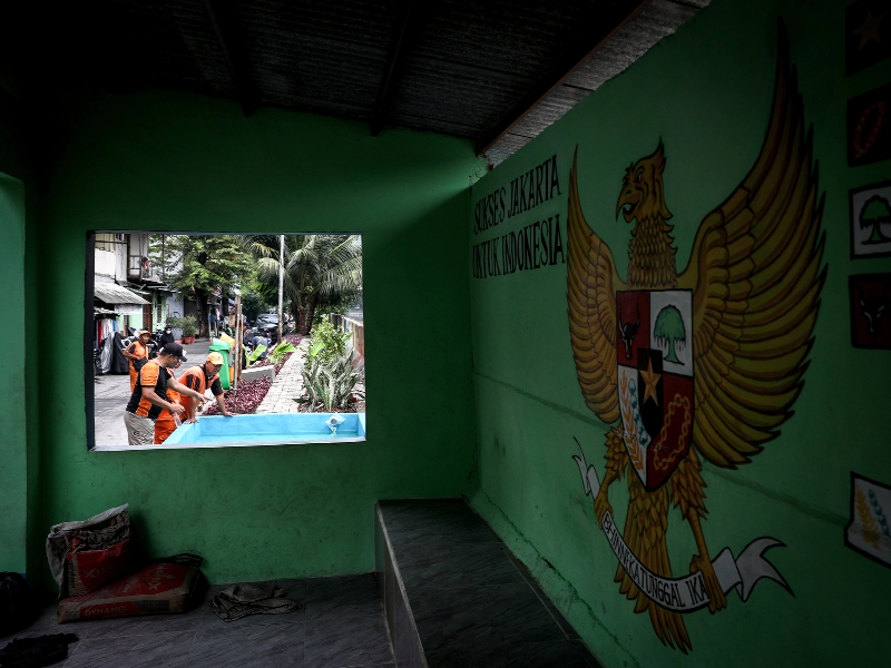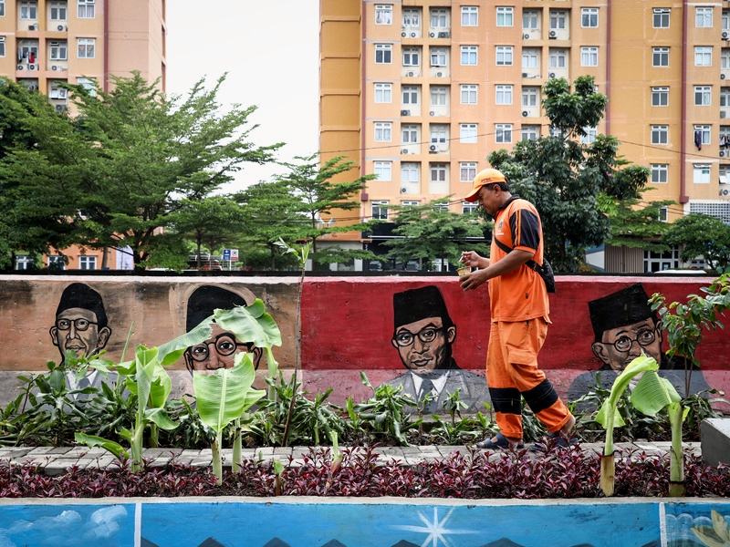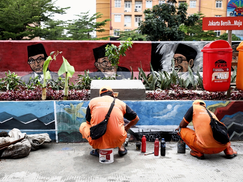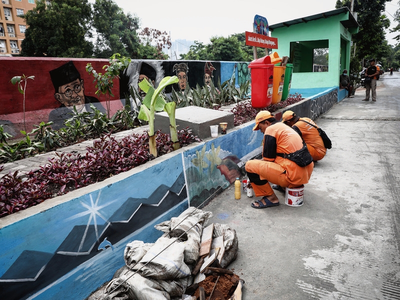 Petugas Penanganan Prasarana dan Sarana Umum (PPSU) Kelurahan Pademangan Timur melukis mural di Jalan Pademangan I RW 03, Kecamatan Pademangan, Jakarta Utara, Rabu (8/2). Mural bertema pemandangan alam dan tokoh bangsa tersebut dilukis di tembok sisi jalan sepanjang 270 meter dan ditargetkan selesai pertengahan Februari 2023. (Foto: Nugroho Sejati/beritajakarta.id)