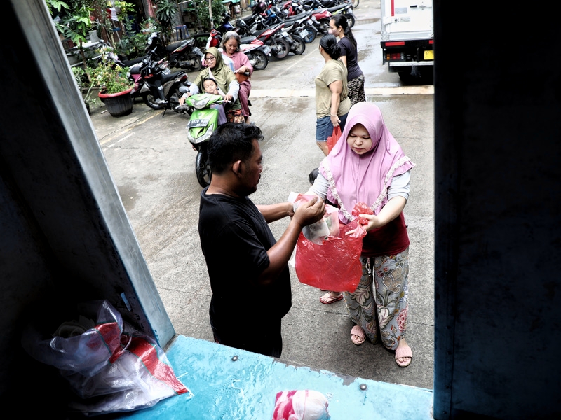 Warga membeli bahan pangan murah bersubsidi di Rumah Susun (rusun) Cipinang Besar Selatan (Cibesel), Jatinegara, Jakarta Timur, Rabu (8/2). Pemprov DKI Jakarta melakukan program penjualan pangan murah bersubsidi yang terdiri dari beras, telur, daging, ikan, dan susu bagi warga penghuni rusun serta penerima manfaat pangan bersubsidi. (Foto:Andri Widiyanto/beritajakarta.id)