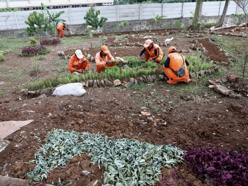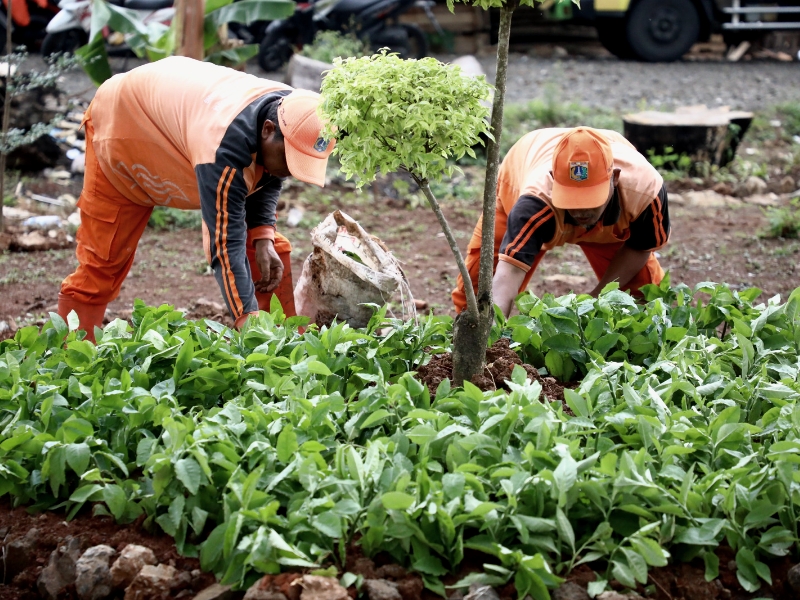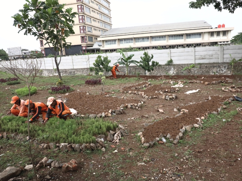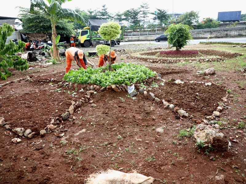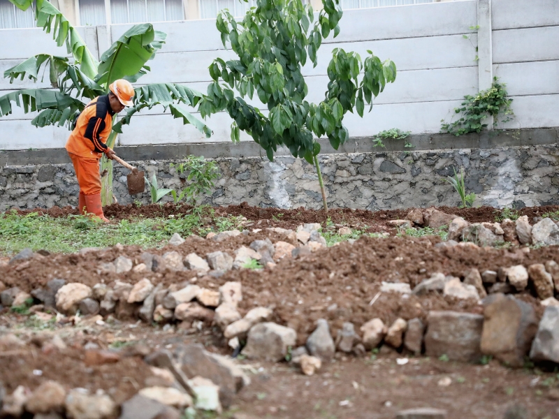 Petugas Penanganan Prasarana dan Sarana Umum (PPSU) Kelurahan Pulo Gebang menyupap lahan kosong tak terpakai menjadi kawasan unggulan di Jalan Damai, Cakung, Jakarta Timur, Rabu (8/2). Lahan dengan luas 300 meter ini akan ditanami berbagai macam tanaman hias seperti melati gambir, gandarusa merah dan hijau serta cemara air. Selain itu petugas juga membuat miniatur kepulauan Indonesia menggunakan batu-batu yang tidak terpakai. (Foto: Mochamad Tresna Suheryanto/beritajakarta.id)