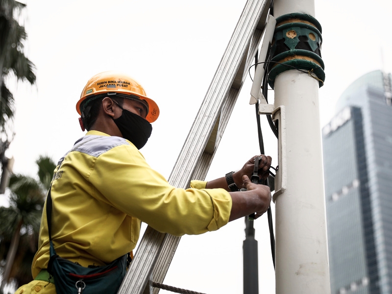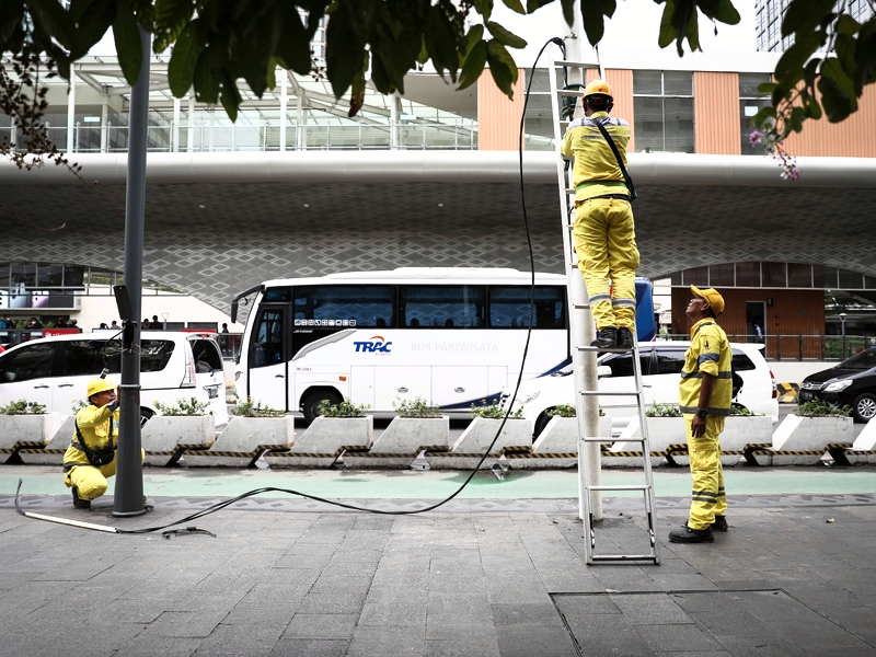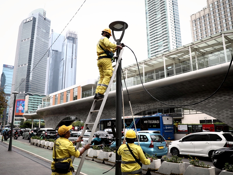 Petugas Suku Dinas Bina Marga Jakarta Pusat memperbaiki lampu penerangan jalan umum (PJU) di Jalan M.H. Thamrin, Kecamatan Menteng, Jakarta Pusat, Rabu (8/2). Sebanyak empat tiang lampu PJU yang padam akibat gangguan kelistrikan kabel bawah tanah tersebut diperbaiki sementara menggunakan aliran listrik dari tiang lampu lain. (Foto: Nugroho Sejati/beritajakarta.id)