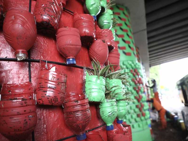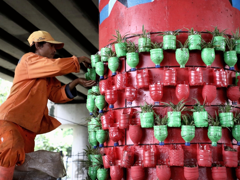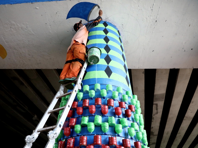 Untuk menghilangkan kesan kumuh petugas Penanganan Prasarana dan Sarana Umum (PPSU) Kelurahan Klender mempercantik Kolong Flyover (FO) Klender dengan vertical garden, mural dan cat warna warni di setiap tiang-tiang Flyover, Sabtu (11/2). Uniknya pembuatan vertical garden ini menggunakan bekas botol plastik yang menjadi wadah tanaman. (Foto: Mochamad Tresna Suheryanto/beritajakarta.id)