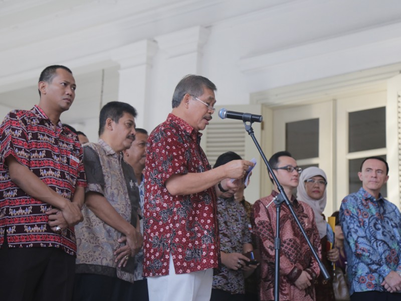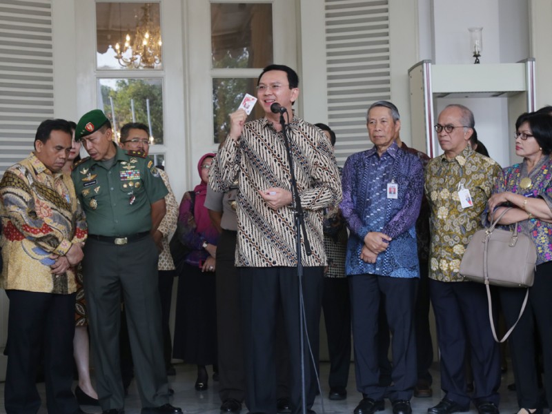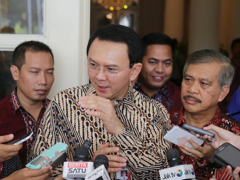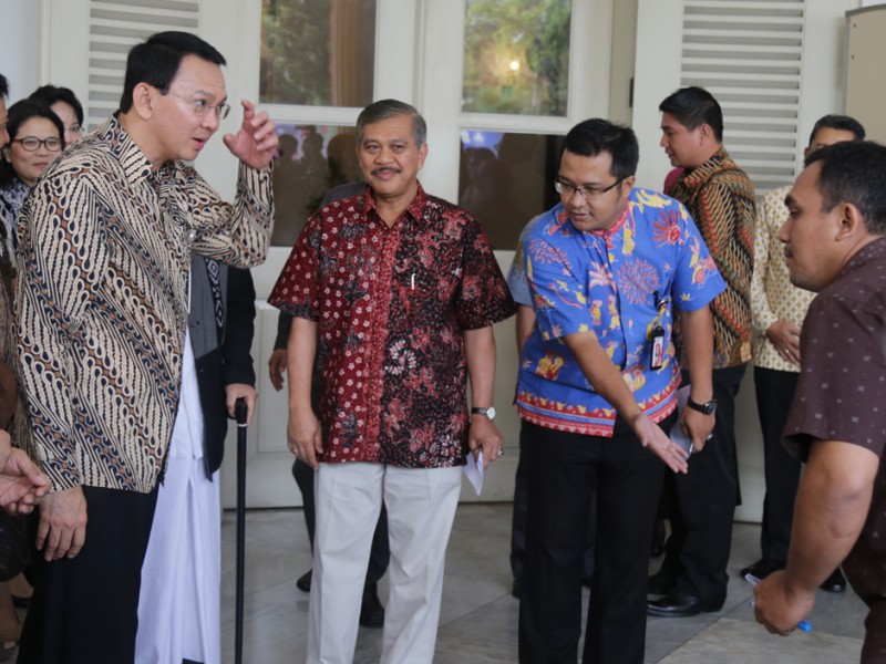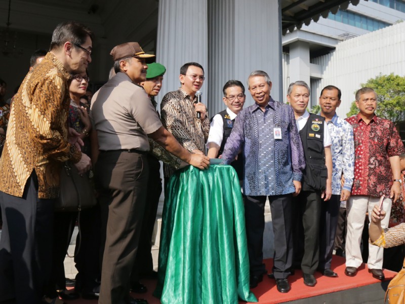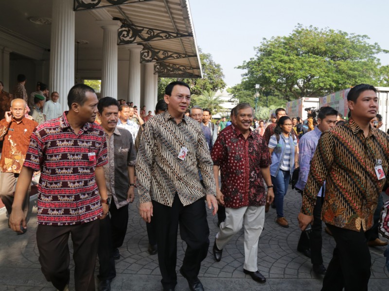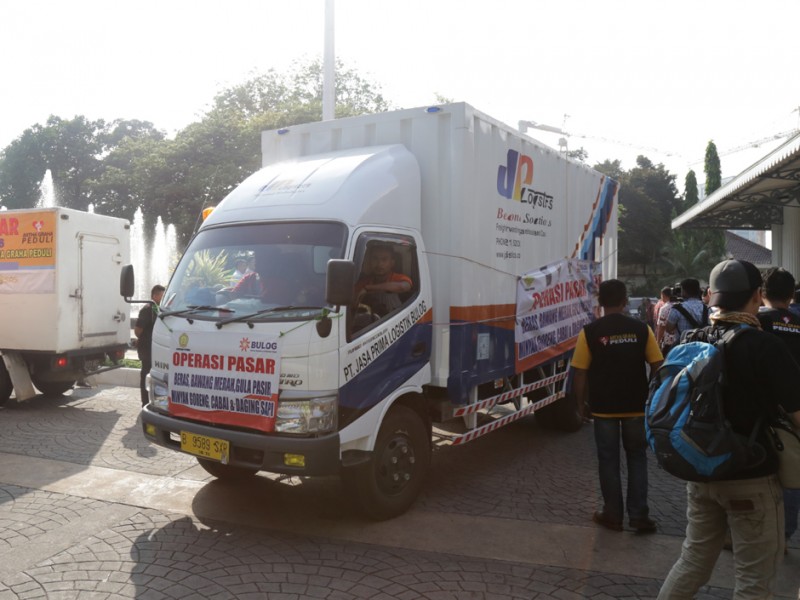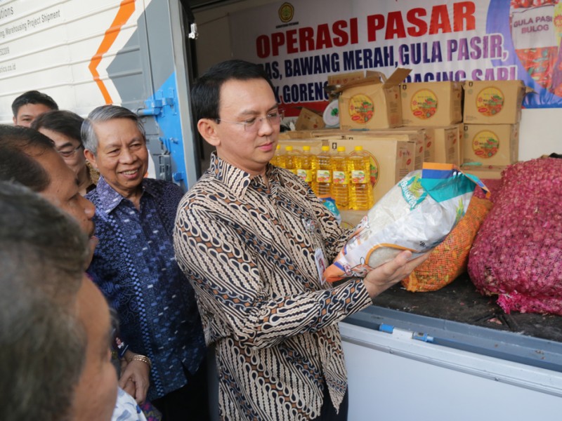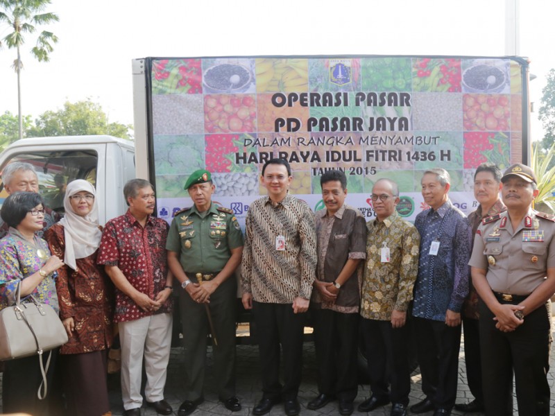 Gubernur DKI Jakarta, Basuki Tjahaja Purnama melepas keberangkatan 33 truk yang mengangkut kebutuhan logistik untuk masyarakat di Balaikota DKI Jakarta, Kamis (02/07/2015). Kebutuhan logistik ini akan dijual di pasar-pasar tradisonal sebagai operasi pasar untuk membantu warga Jakarta jelang Lebaran. Sebab, biasanya harga sejumlah kebutuhan baik pangan maupun sandang mendadak meroket sehingga cukup membebani masyarakat terutama keluarga miskin. (Foto: Reza/beritajakarta.com)