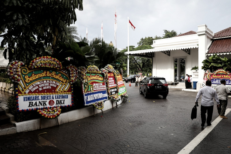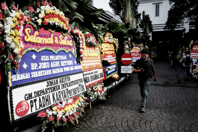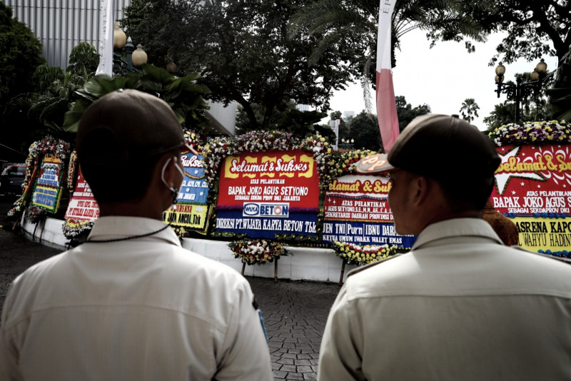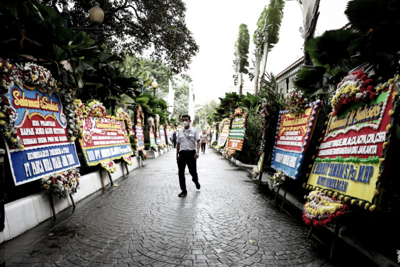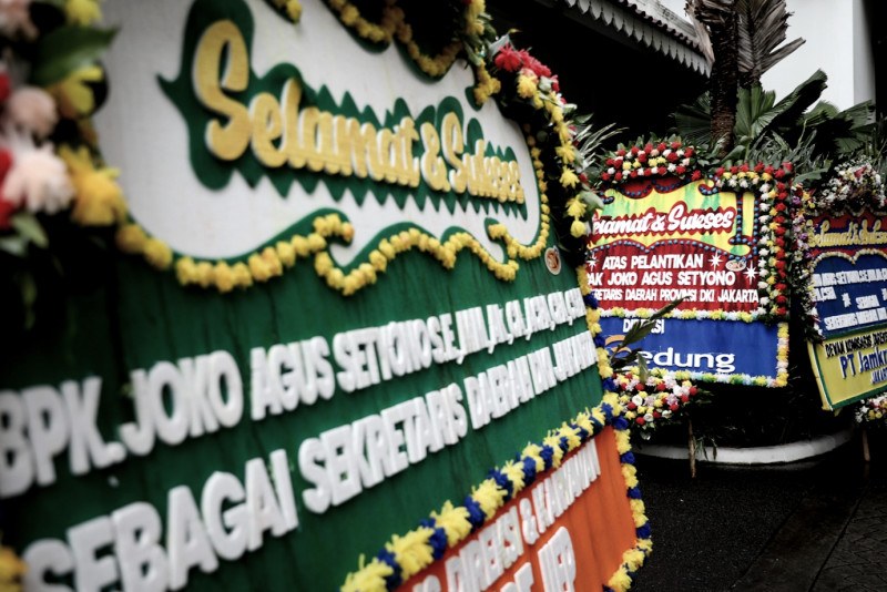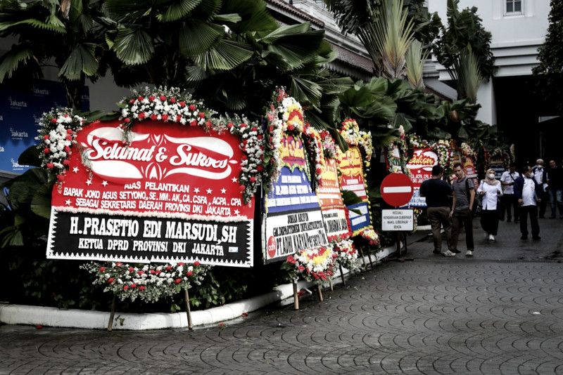 Puluhan karangan bunga ucapan selamat atas pelantikan Sekretaris Daerah (Sekda) Provinsi DKI Jakarta menghiasi halaman Balai Kota DKI Jakarta, Gambir, Jakarta Pusat, Rabu (15/2). Penjabat (Pj) Gubernur DKI Jakarta, Heru Budi Hartono, melantik Joko Agus Setyono sebagai Sekda Provinsi DKI Jakarta pada Rabu sore di Balai Agung DKI Jakarta. (Foto: Nugroho Sejati/beritajakarta.id)