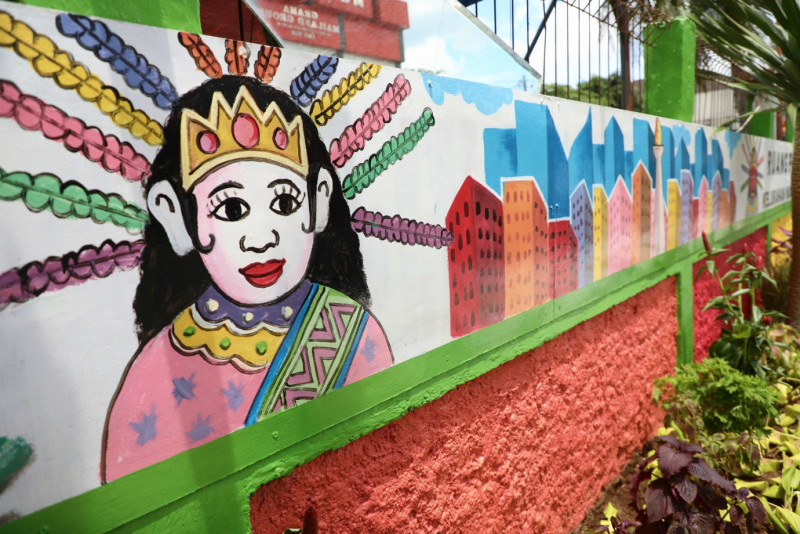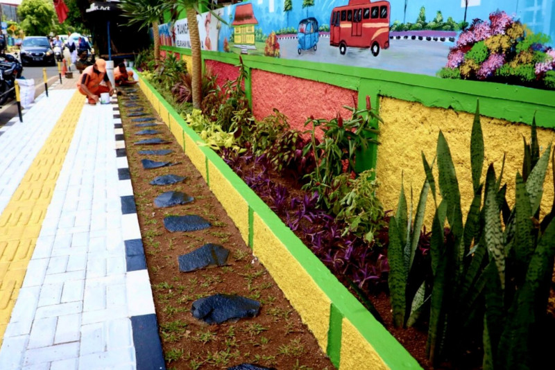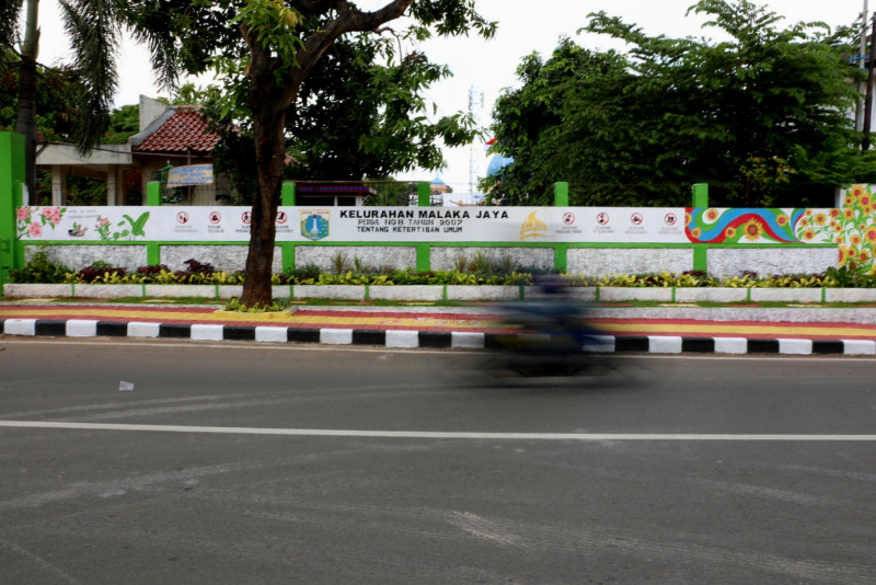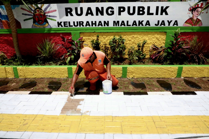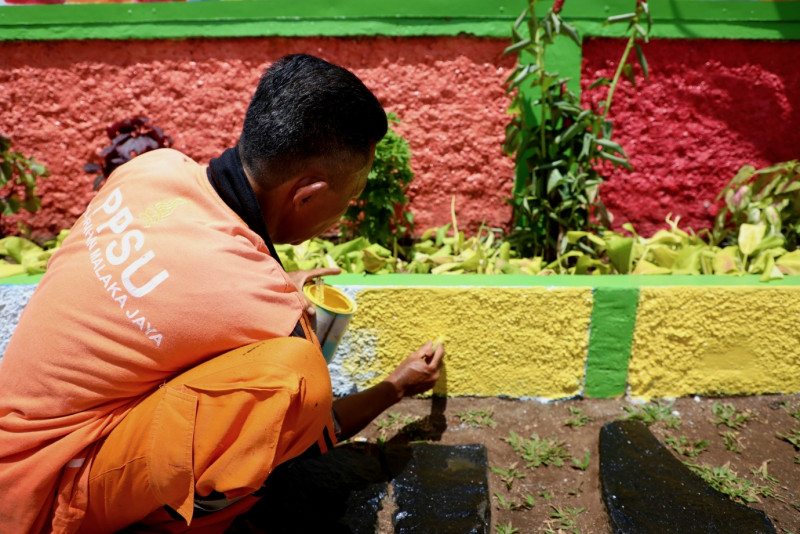 Petugas Penanganan Prasarana dan Sarana Umum (PPSU) Kelurahan Malaka Jaya melakukan penataan kawasan unggulan di Jl Mawar Merah Raya, No.01, Rt.13, Rw.03, Malaka Jaya, Duren Sawit, Jakarta Timur, Senin (20/2). Kawasan yang dulunya tak terawat kini dihiasi dengan berbagai tanaman hias dan mural-mural yang bertemakan DKI Jakarta. (Foto: Mochamad Tresna Suheryanto/beritajakarta.id)