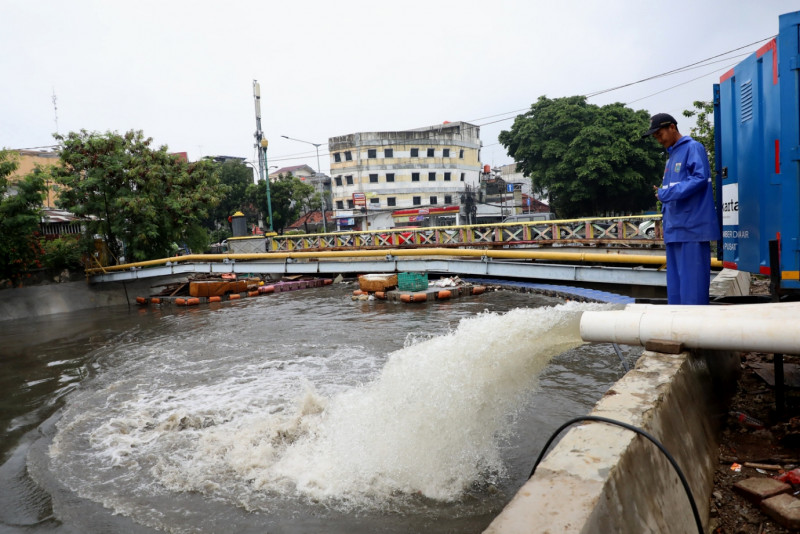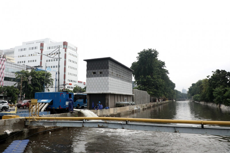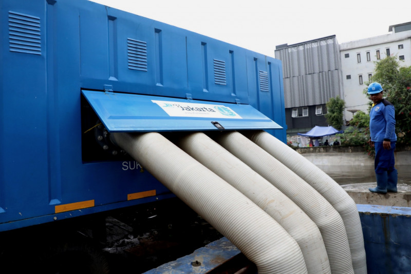 Petugas Suku Dinas Sumber Daya Air (Sudin SDA) Jakarta Pusat mengerahkan satu unit pompa trailer di pintu air olakan Golden Trully di Jalan Gunung Sahari Raya, Gunung Sahari Selatan, Kemayoran, Jakarta Pusat, Jumat (24/2). Pompa trailer yang memliki kapasitas penyedotan 500 liter perdetik ini dioperasikan untuk menangani genangan air di kawasan Sawah Besar, sehingga penanganan lebih cepat surut.(Foto: Mochamad Tresna Suheryanto/beritajakarta.id)