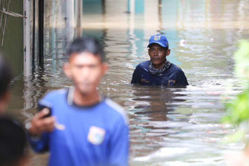 Sejumlah petugas gabungan dari BPBD DKI Jakarta, PPSU Kelurahan Kampung Melayu, Sudin SDA Jakarta Timur dan personel kepolisian menangani banjir di RT 13 RW 04, Kampung Melayu, Jatinegara, Jakarta Timur, Senin (27/2). Banjir setinggi 1-2 meter yang merendam dua RT di Kampung Melayu terjadi akibat luapan Kali Ciliwung disertai curah hujan tinggi. (Foto: Nugroho Sejati/beritajakarta.id)