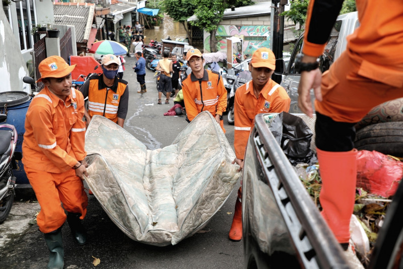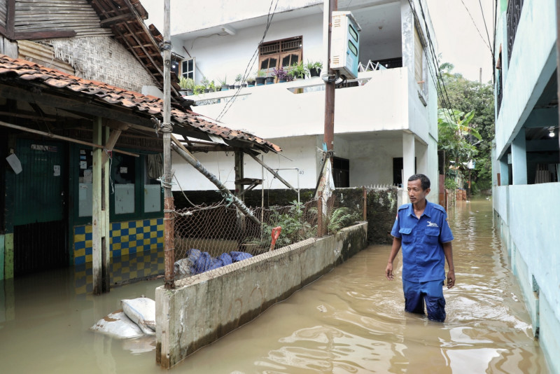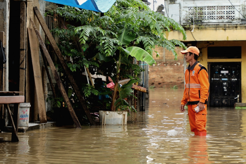 Camat Pancoran, Alamsyah bersama PPSU Kelurana Rawajati dan Satuan Pelaksana Sumber Daya Air (Satpel SDA) Kecamatan Pancoran meninjau genangan di Jalan Bina Warga, Kelurahan Rawajati, Pancoran, Jakarta Selatan, Senin (27/2). Camat menghimbau warga yang ingin mengungsi Tersedia posko tanggap bencana yang berada di Kantor Kelurahan Rawajati dan Kantor Kecamatan Pancoran. (Foto: Andri Widiyanto/beritajakarta.id)