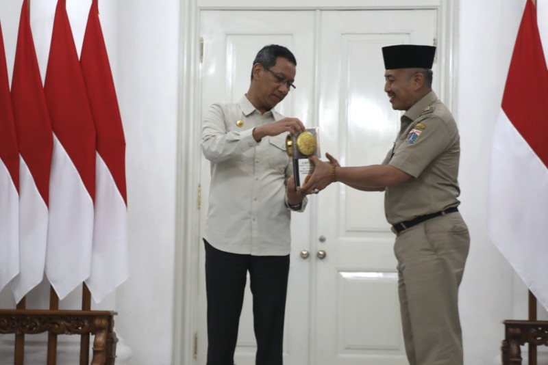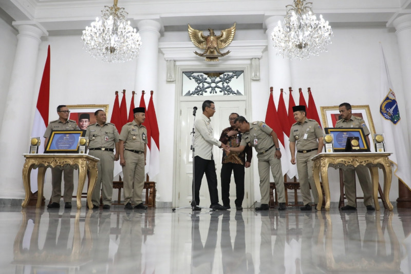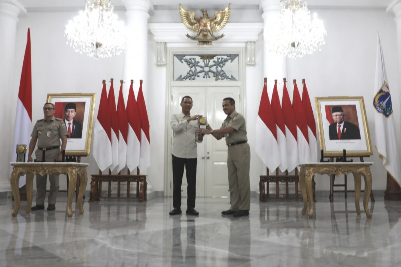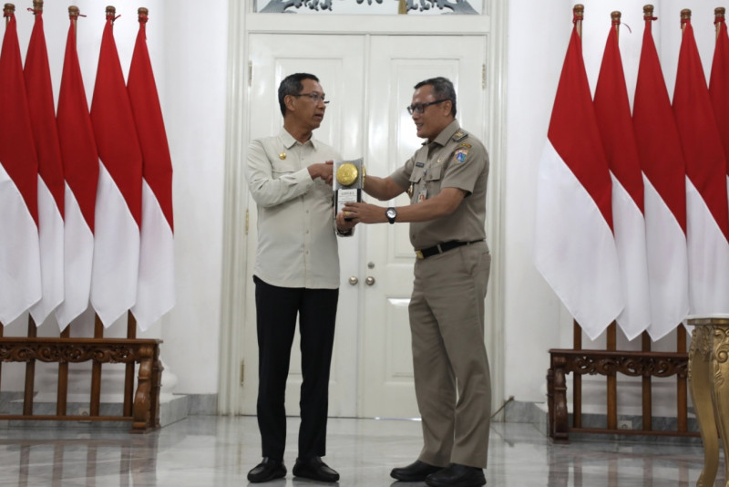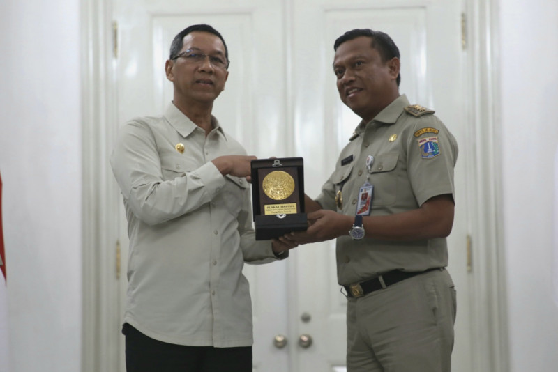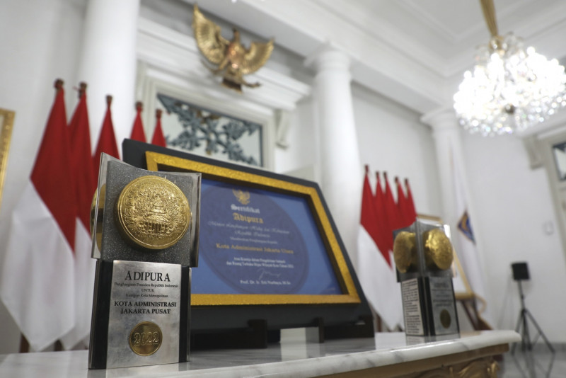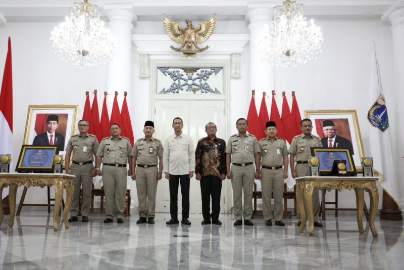 Lima wilayah kota dan Kabupaten Kepulauan Seribu di Provinsi DKI Jakarta, meraih Piala dan Sertifikat Adipura dari Kementerian Lingkungan Hidup dan Kehutanan RI. Penghargaan terdiri dari empat piala, dua sertifikat dan satu plakat diserahkan wali kota dan bupati kepada Penjabat (Pj) Gubernur DKI Jakarta, Heru Budi Hartono, Selasa (28/2) di Balairung, Balai Kota DKI Jakarta. (Foto: Mochamad Tresna Suheryanto/ beritajakarta.id)