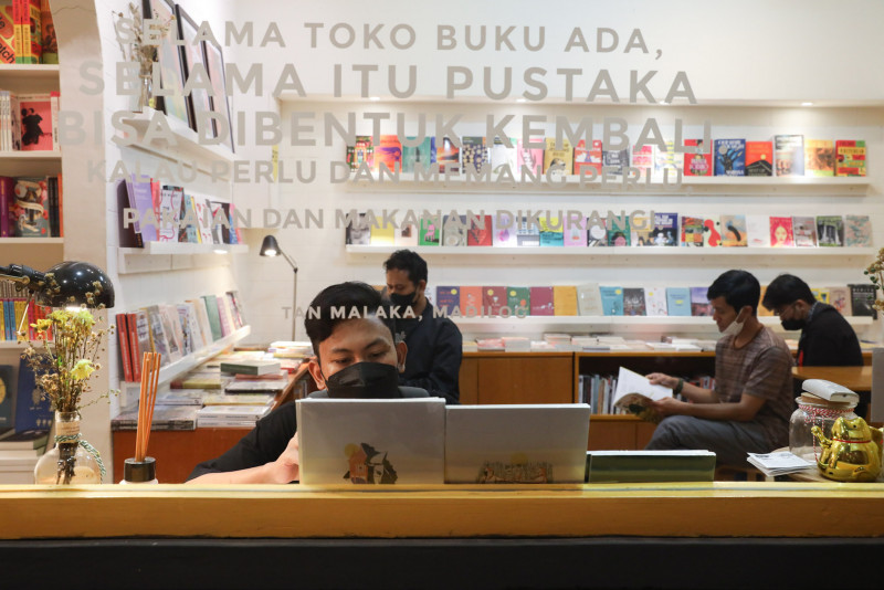 Sejumlah pengunjung memilih dan menbaca buku di toko buku dan penerbit POST yang berada di Pasar Santa lantai satu, Jalan Cipaku I, Kebayoran Baru, Jakarta Selatan, Jumat (3/3). POST yang sudah ada sejak tahun 2014 ini merupakan toko buku alternatif dan independen yang terbuka sebagai ruang baca dan diskusi bagi pengunjung. (Foto: Nugroho Sejati/beritajakarta.id)
