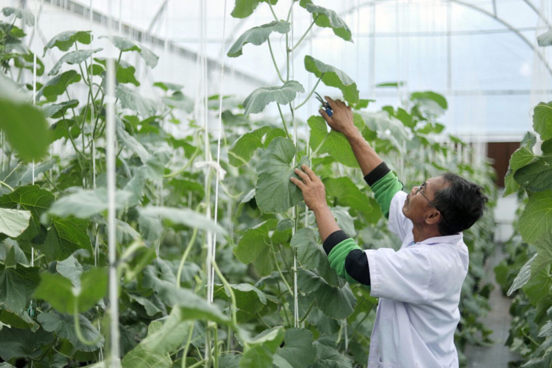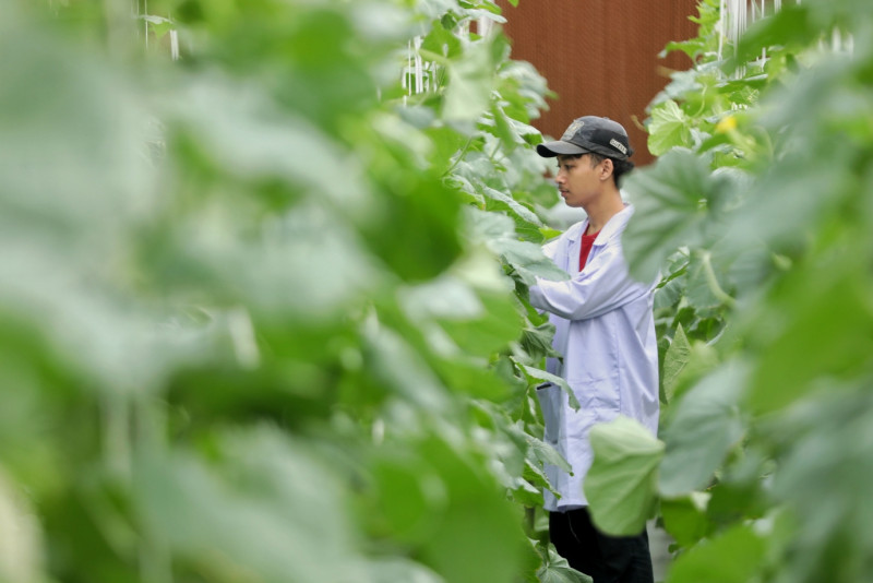 Petugas melakukan pengecekan rutin di Smart Green House (SGH), Agro Edukasi Wisata (AEW) Ragunan, Pasar Minggu, Jakarta Selatan, Jumat (3/3). SGH merupakan pertanian modern yang memanfaatkan sistem Internet of Think (IoT) dengan sistem ini bisa mengontrol kelembaban, suhu, nutrisi serta cuaca dari jarak jauh melalui aplikasi pada ponsel android. (Foto: Andri Widiyanto/beritajakarta.id)