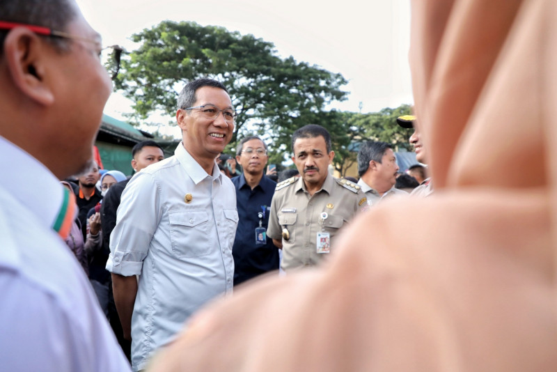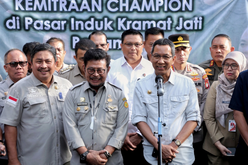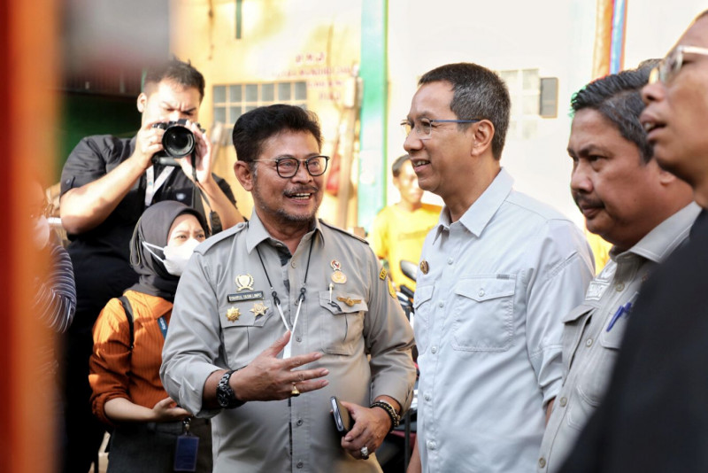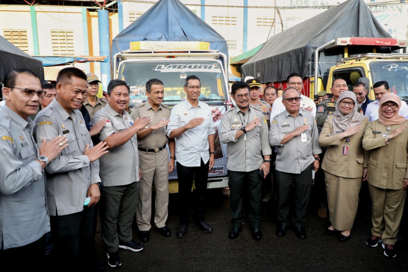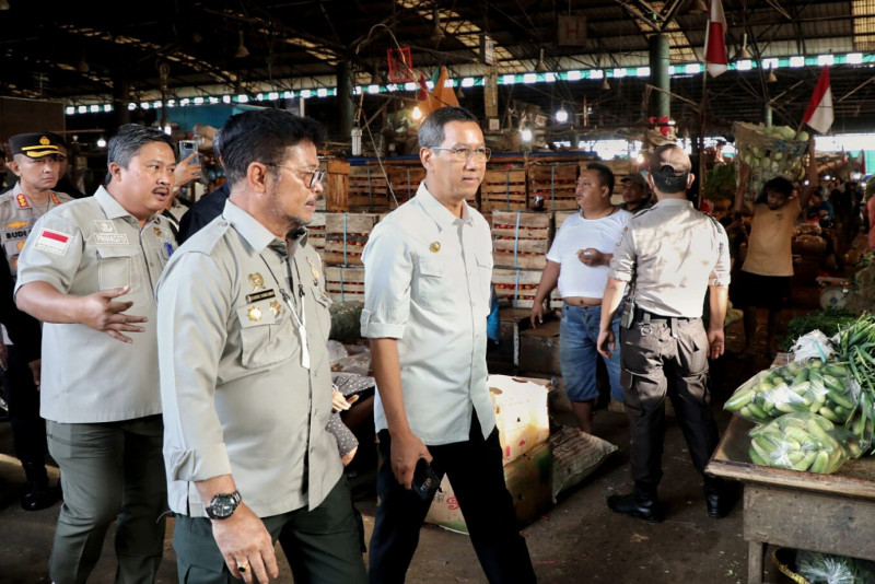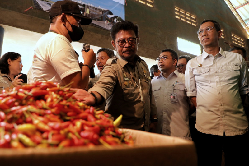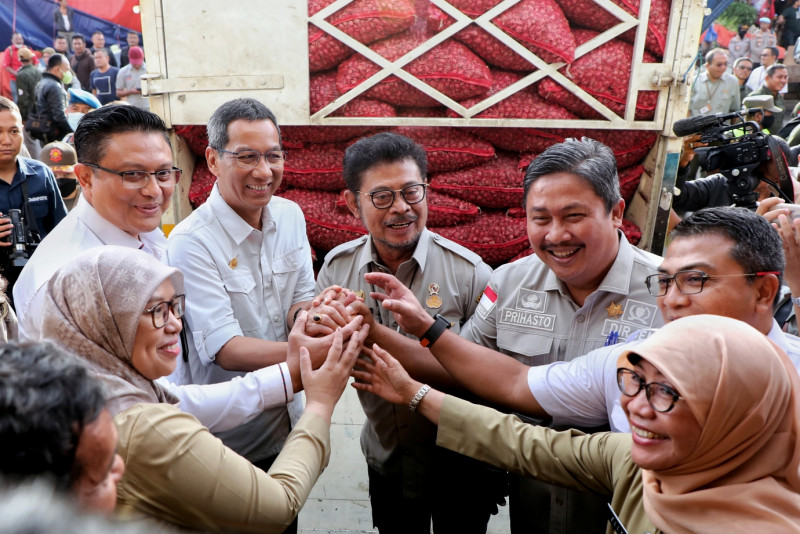 Penjabat Gubernur (Pj) Provinsi DKI Jakarta, Heru Budi Hartono dan Menteri Pertanian RI (Mentan RI), Syahrul Yasin Limpo menghadiri acara serah terima hasil panen bawang merah, cabai rawit dan cabai keriting dari Kementerian Pertanian RI (Kementan RI) ke Pemprov DKI Jakarta di Pasar Induk Kramat Jati, Jakarta Timur, Senin (6/3). Kementan RI menyalurkan 17 ton cabai dan 175 ton bawang merah ke Pasar Induk Kramat Jati untuk ketersediaan stok jelang Ramadan dan Idul Fitri. (Foto: Andri Widiyanto/beritajakarta.id)