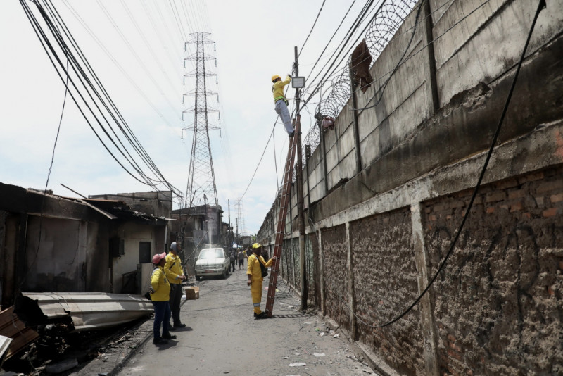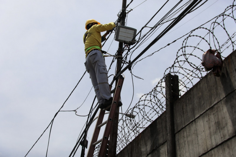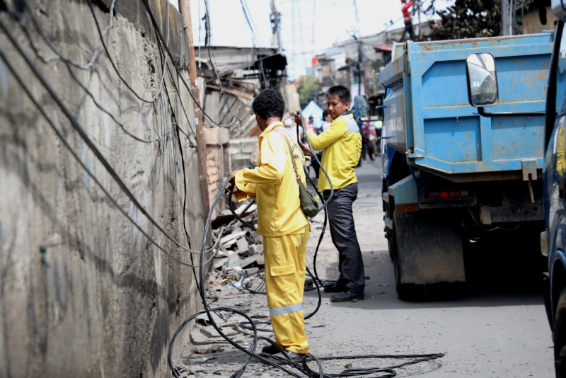 Delapan petugas Suku Dinas Bina Marga Jakarta Utara melakukan pemasangan tiga lampu sorot di lokasi kebakaran Jalan Koramil, Kelurahan Rawa Badak Selatan, Kecamatan Koja, Jakarta Utara, Senin (6/3). Pemasanagan lampu sorot sengaja dipasang khusus untuk memberikan penerangan yang lebih maksimal bagi warga yang terdampak kebakaran. (Foto: Mochamad Tresna Suheryanto/beritajakarta.id)