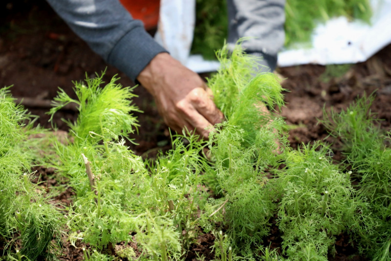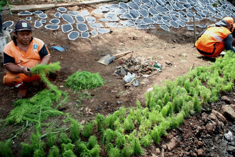 Melihat Petugas Penanganan Prasarana dan Sarana Umum Kelurahan Cakung Timur dan Cakung Barat melakukan penataan kawasan unggulan dengan mempercantik kolong tol JORR Cakung Cilincing, Jalan Sri Sultan Hamengkubowono IX, Cakung , Jakarta Timur, Selasa (7/3). Kolong tol ini dipercantik dengan mural dan berbagai tanaman hias untuk mempercantik kawasan ditargetkan selesai pada 31 Maret mendatang. (Foto: Mochamad Tresna Suheryanto/beritajakarta.id)