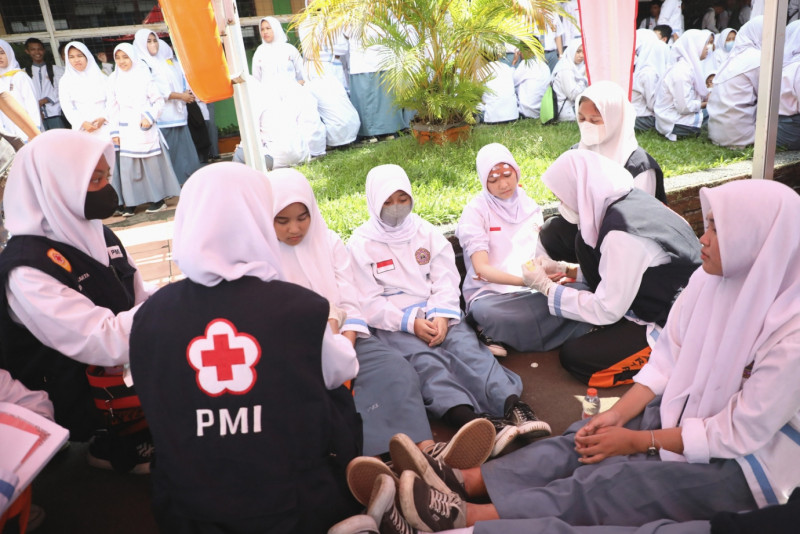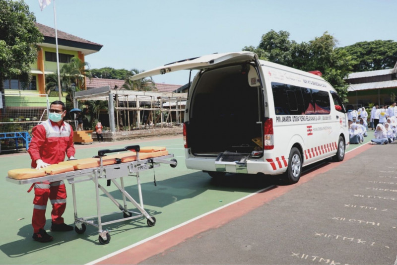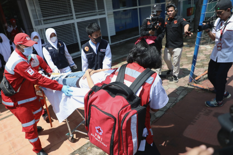 Palang Merah Indonesia (PMI) Jakarta Utara bersama Suku Dinas Pendidikan Jakarta Utara dan Beritajakarta sebagai Media Partner menggelar kegiatan PMI Goes to School di Sekolah Menengah Kejuruan Negeri (SMKN) 56 Jakarta, Jalan Pluit Timur Raya No.01, Pluit, Penjaringan, Jakarta Utara, Jumat (10/3). Sebanyak 1.600 peserta didik SMKN 56 yang mengikuti kegiatan mitigasi bencana gempa ini, diharapkan lebih sigap dan tidak panik jika sewaktu-waktu dilanda bencana. (Foto:Mochmad Tresna Suheryanto/beritajakarta.id)